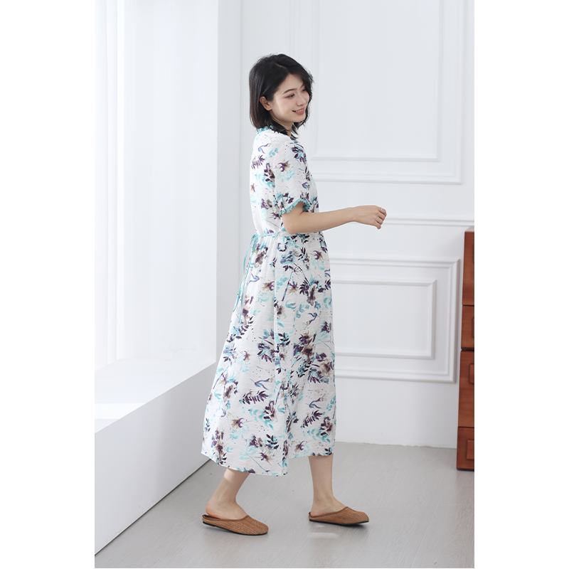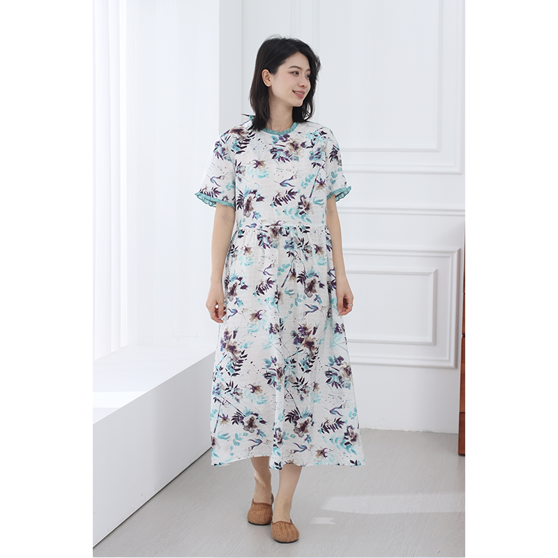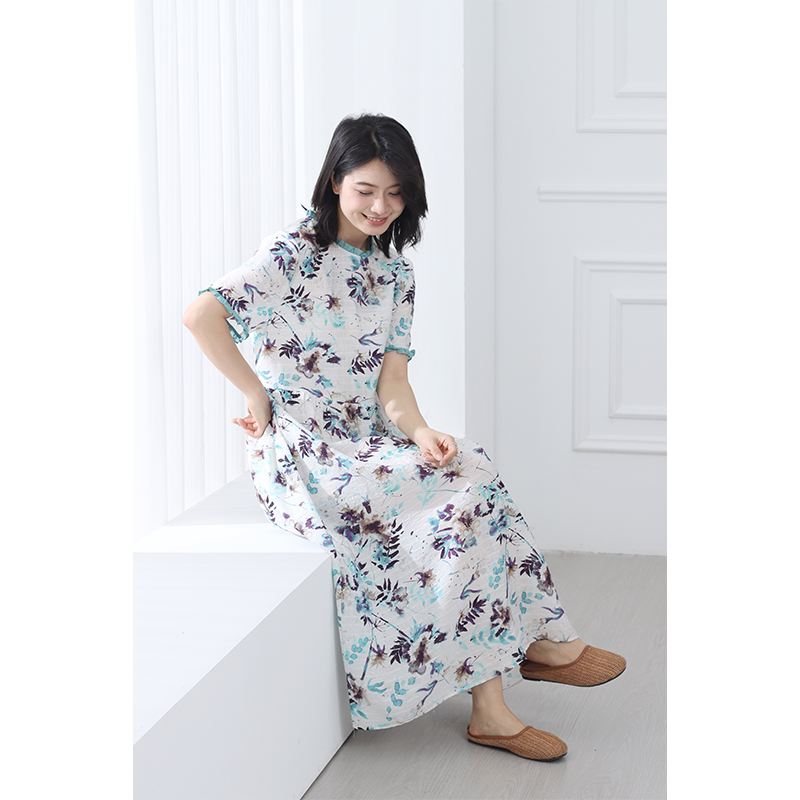 无色无味夏季新款收腰气质文艺木耳边碎花圆领高级感长款连衣裙