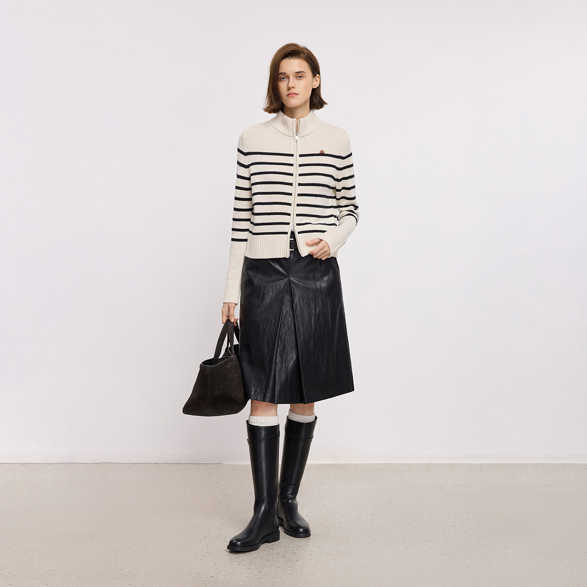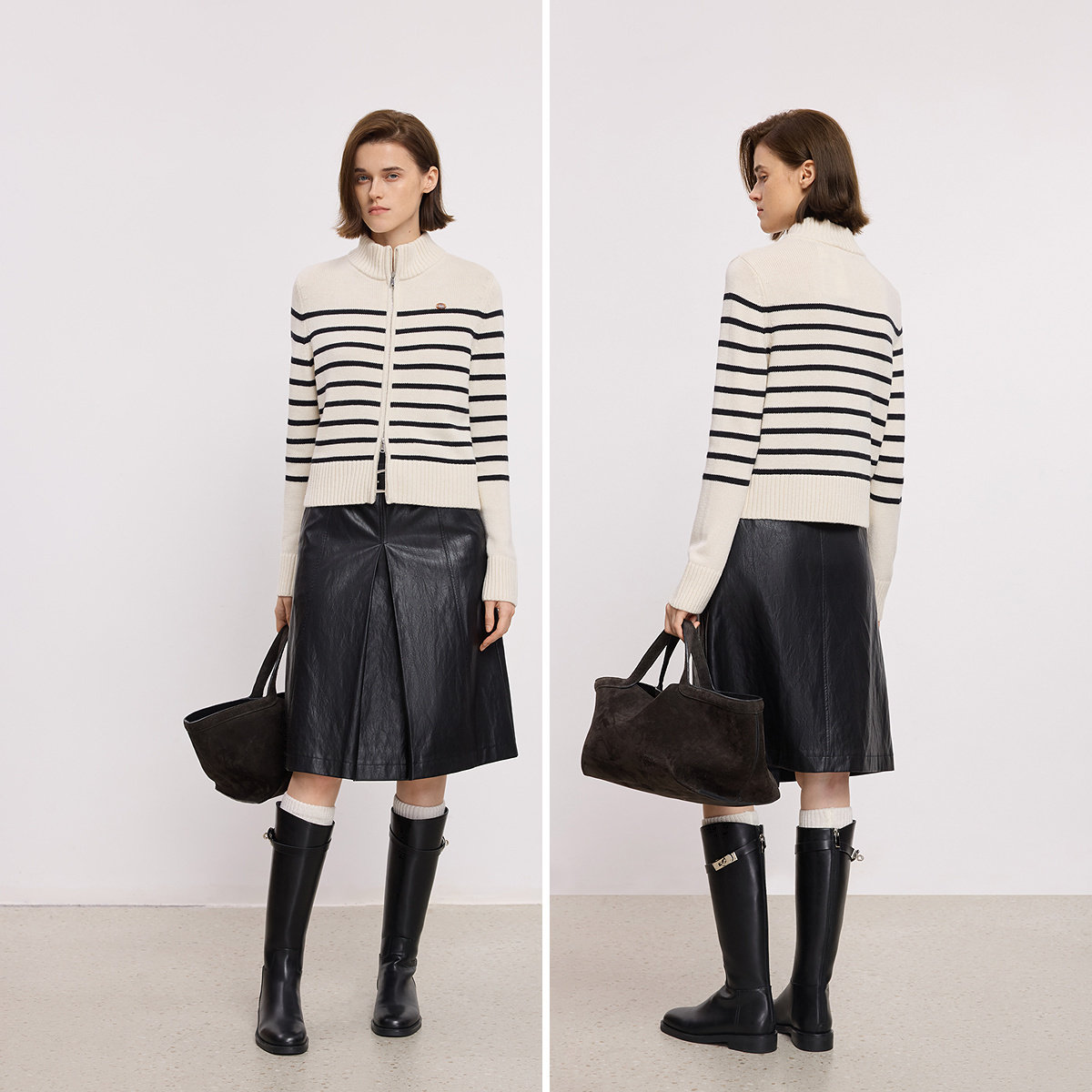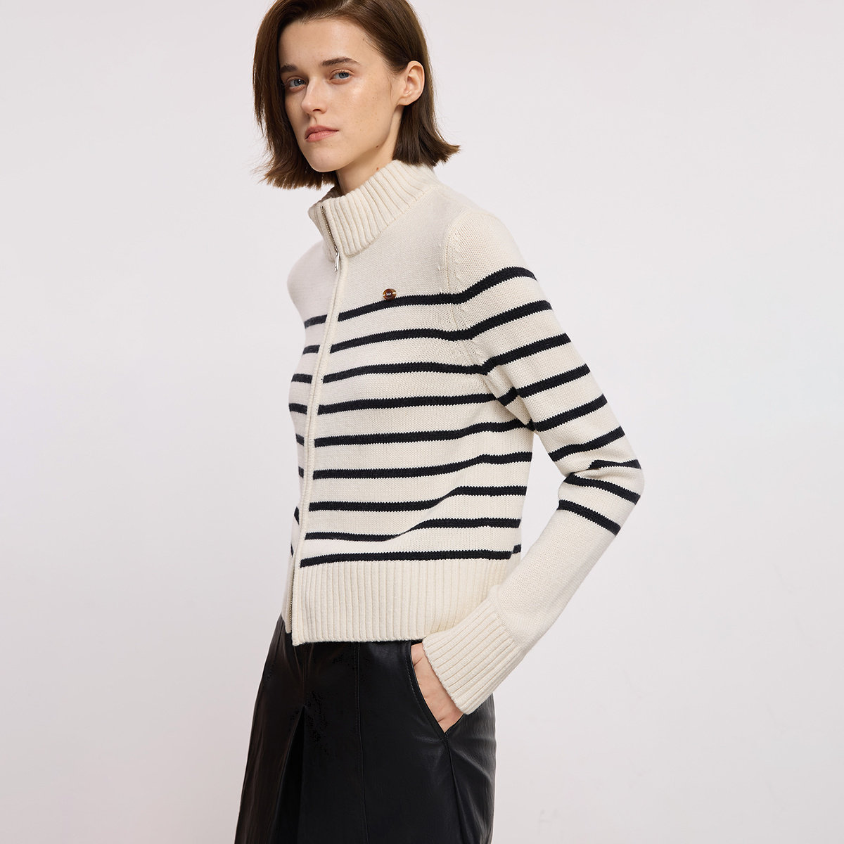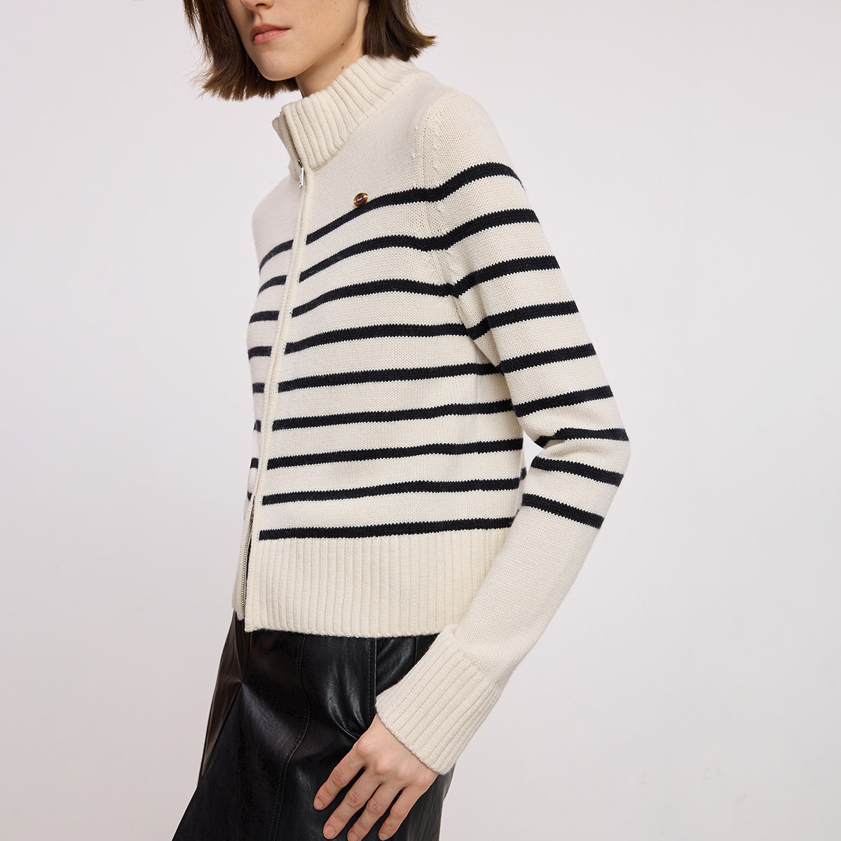 LILY2025冬新款含羊毛撞色条纹半高领气质通勤白色针织开衫毛衣女
