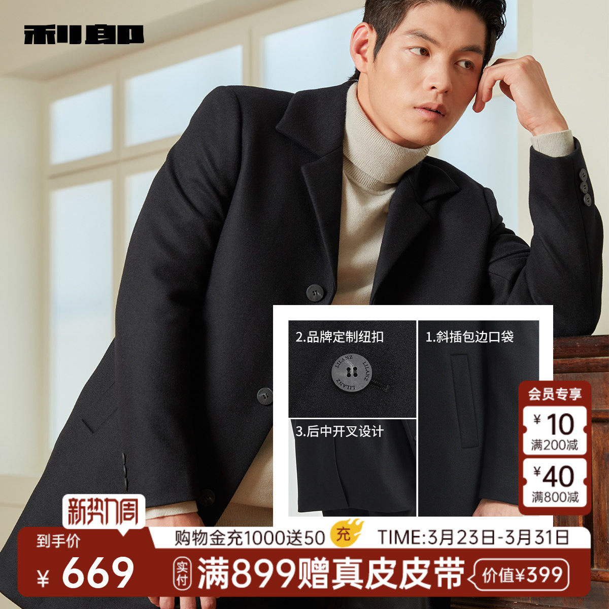 【白焰光暖】利郎官方毛呢大衣男士冬季新款中长款保暖外套男装