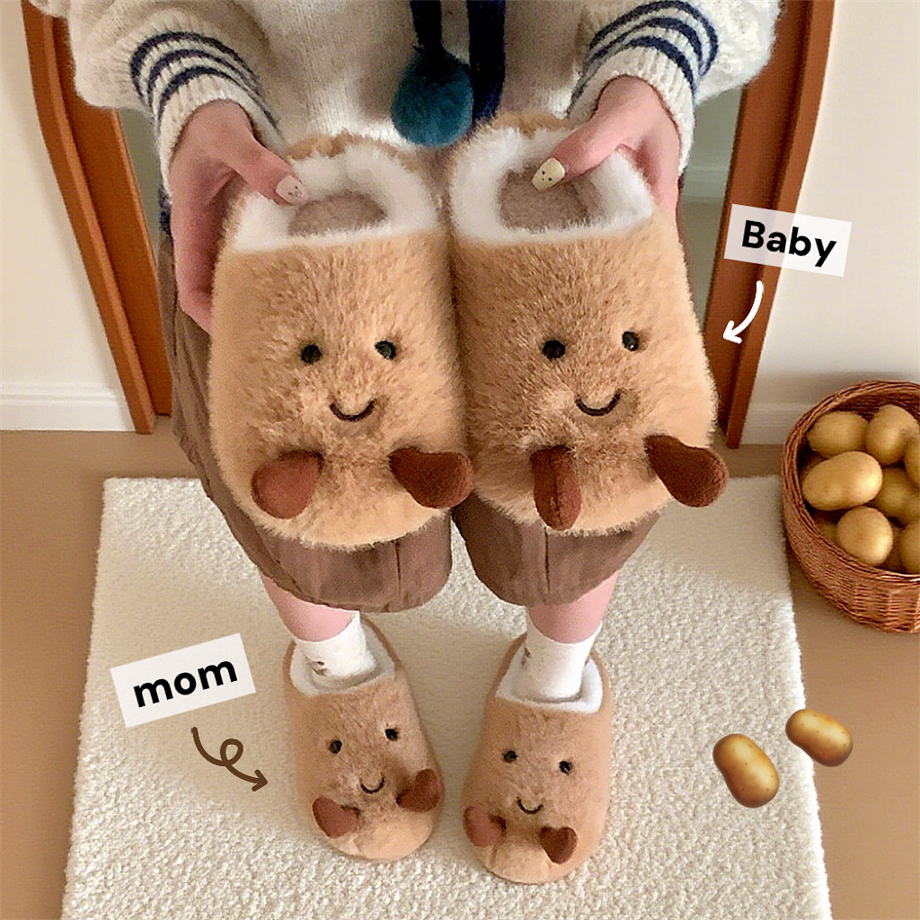 细细条可爱土豆煎蛋棉拖鞋女冬趣味防滑亲子家居鞋保暖毛毛鞋ins