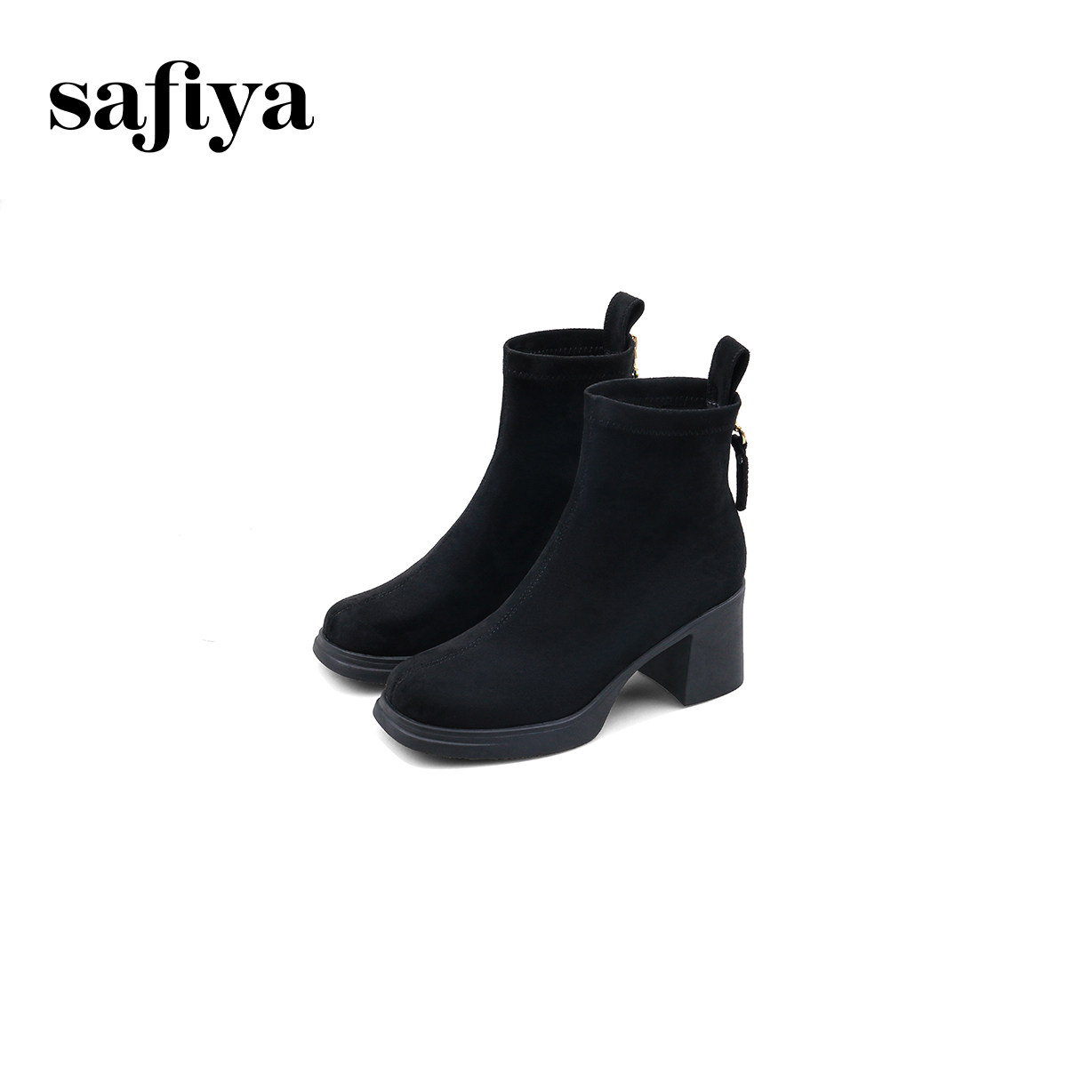 Safiya/索菲娅冬英伦风方头小众粗跟设计感瘦瘦弹力时尚短靴