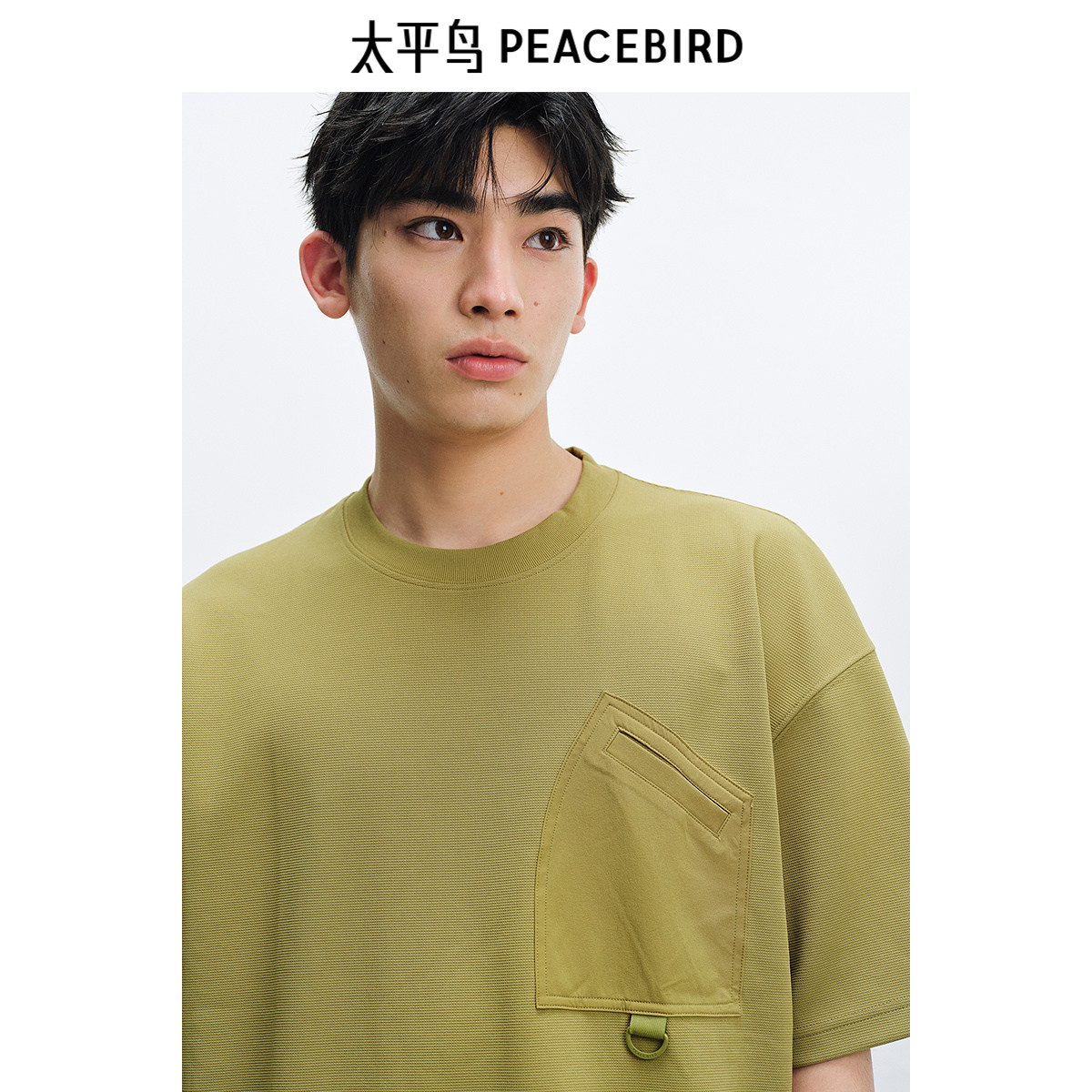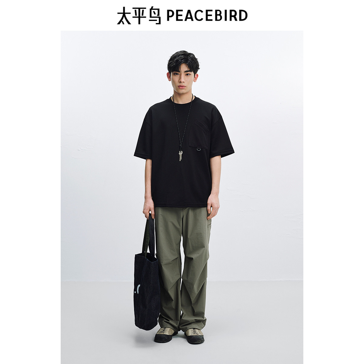 太平鸟男装 黑色短袖t恤男25夏新款重磅工装户外宽松纯色体恤潮