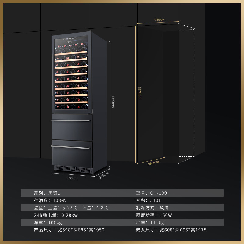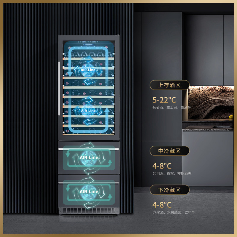 维佳德CH-190三门变频三温抽屉柜冰吧恒温红酒柜黑钢嵌入式冷藏柜