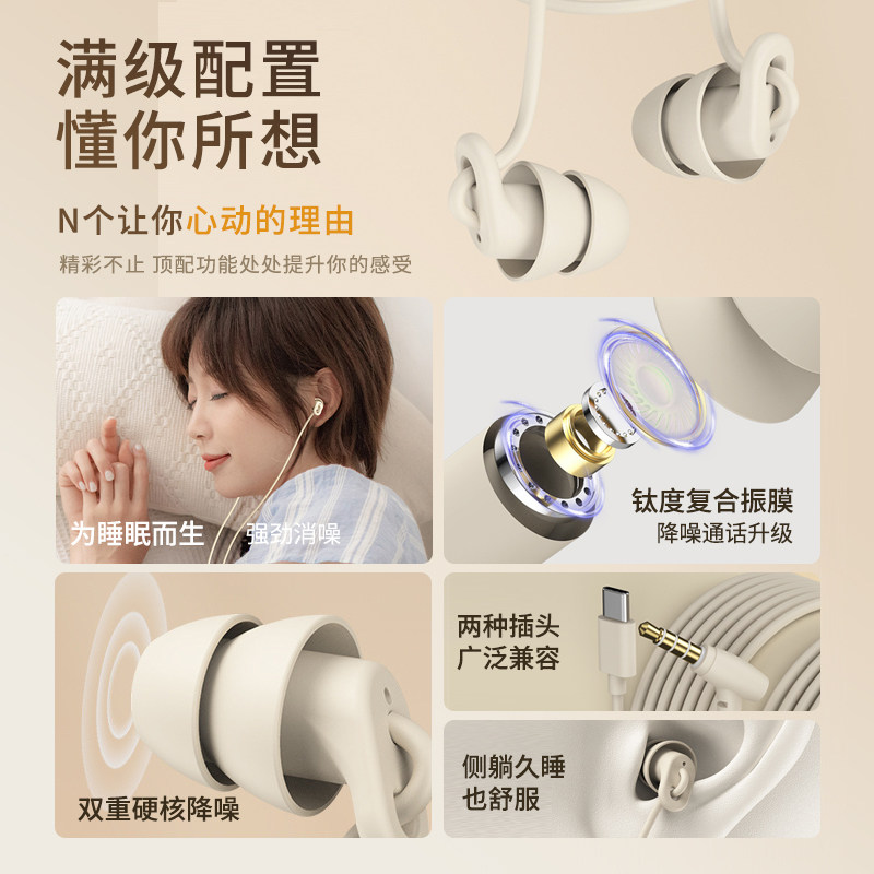睡眠耳机有线睡觉专用降噪typec宿舍防吵隔音耳塞久戴不压耳侧睡