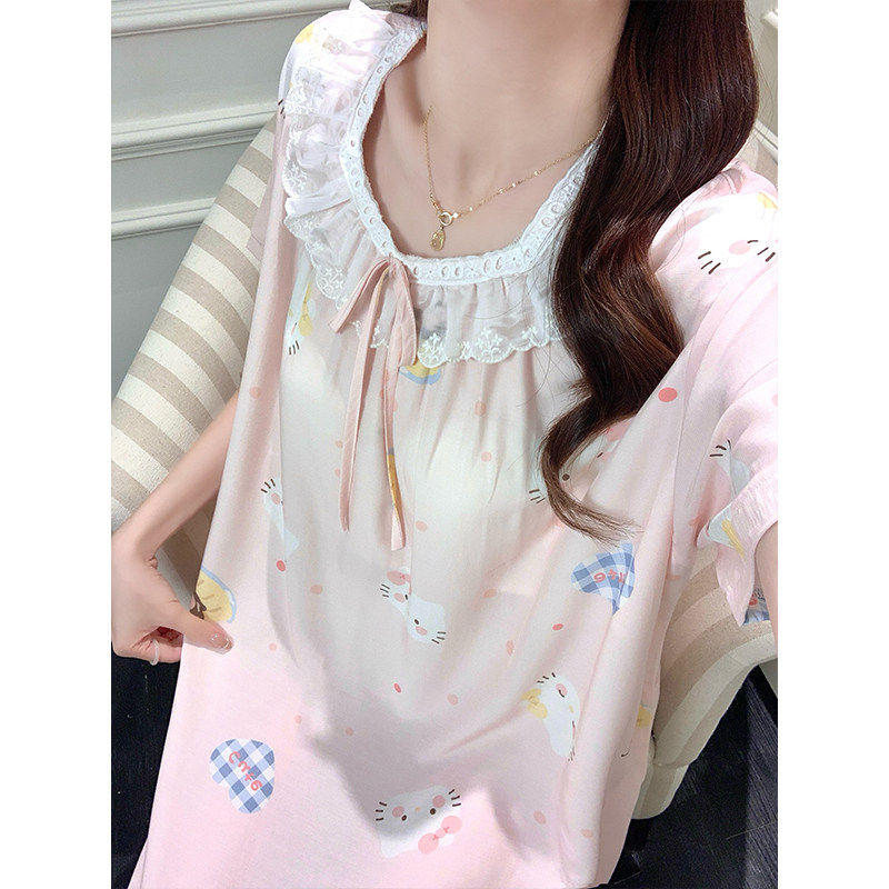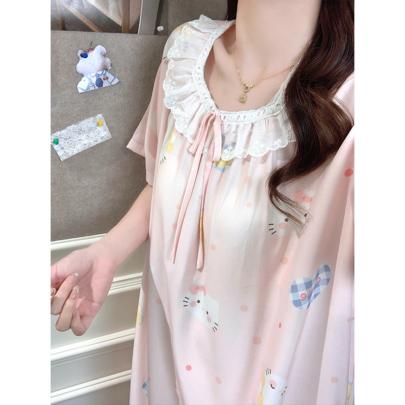 带胸垫云朵棉睡裙女夏季蕾丝甜美少女短袖中长裙可爱风棉绸家居服