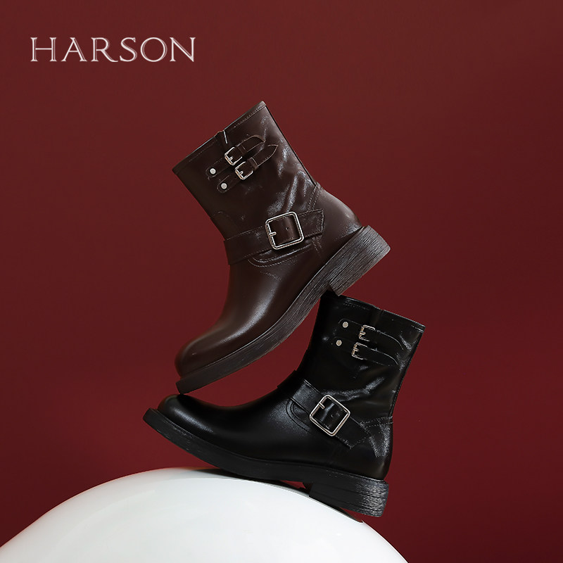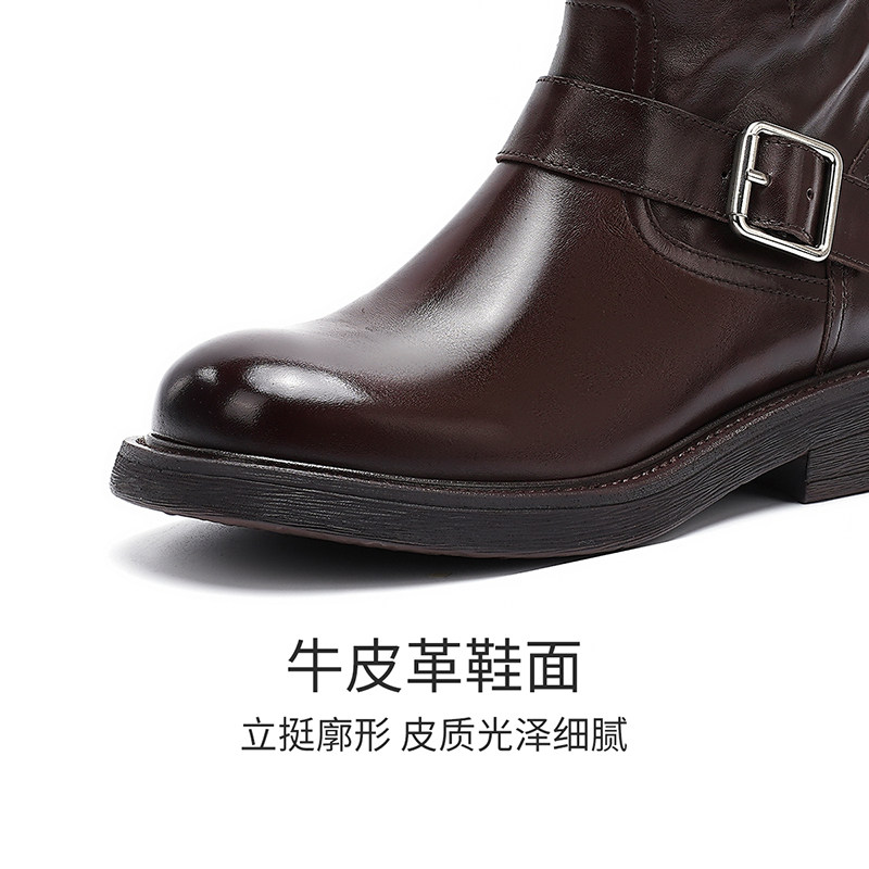 哈森复古西部牛仔靴女新款户外机车靴皮带扣骑士靴HA243401