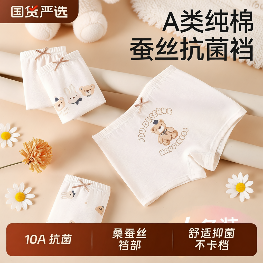 10A抗菌桑蚕丝裆部女童纯棉内裤儿童大中小童四角平角女孩底裤宝