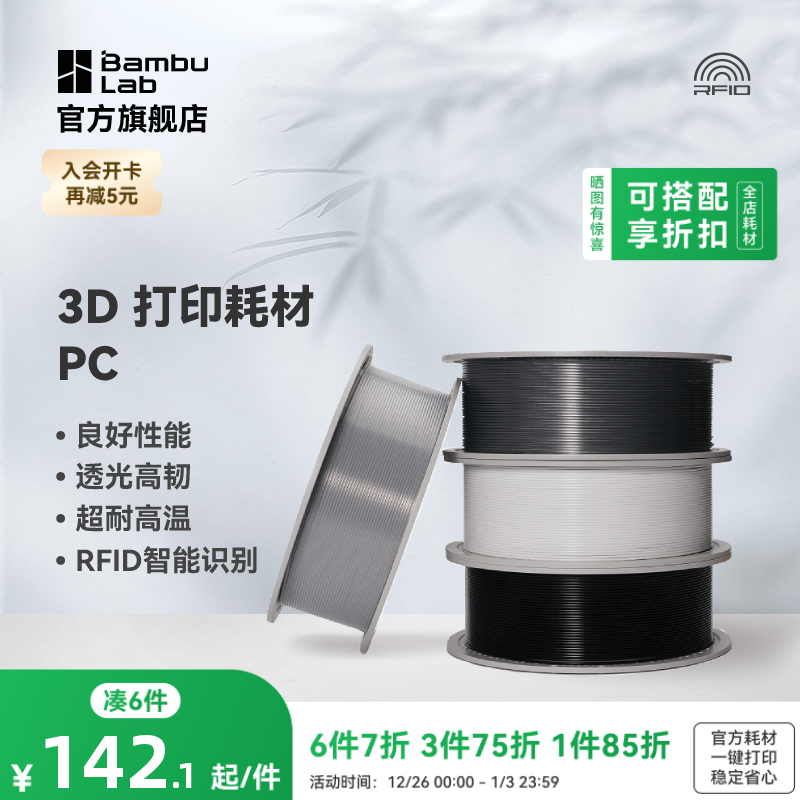 拓竹PC 3D打印耗材 良好机械性透光 耐高温高韧性易打印 RFID智能参数识别