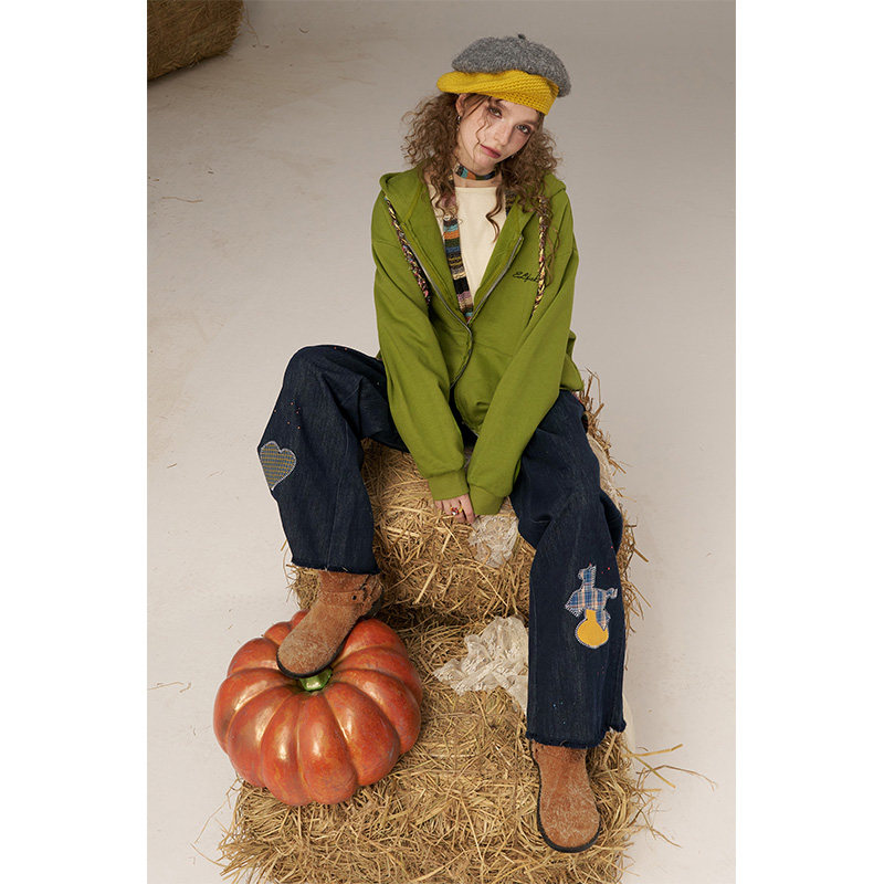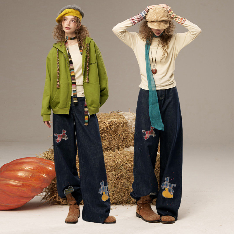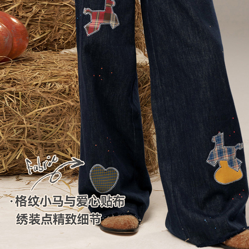 妖精的口袋复古贴布绣高腰直筒牛仔裤女2025秋冬新款显瘦阔腿裤子