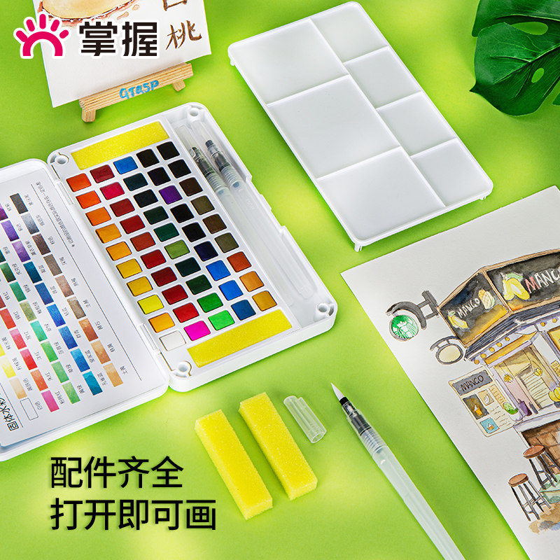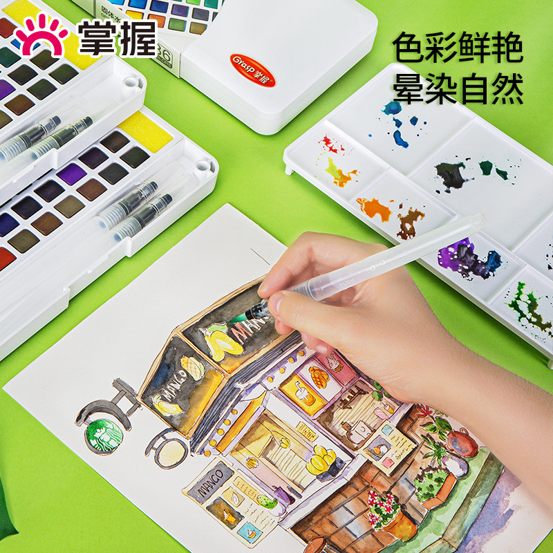 掌握固体颜料小学生专用24色36色48色美术专业绘画工具套装初学者学生用便携固体粉饼颜料盒手绘画笔