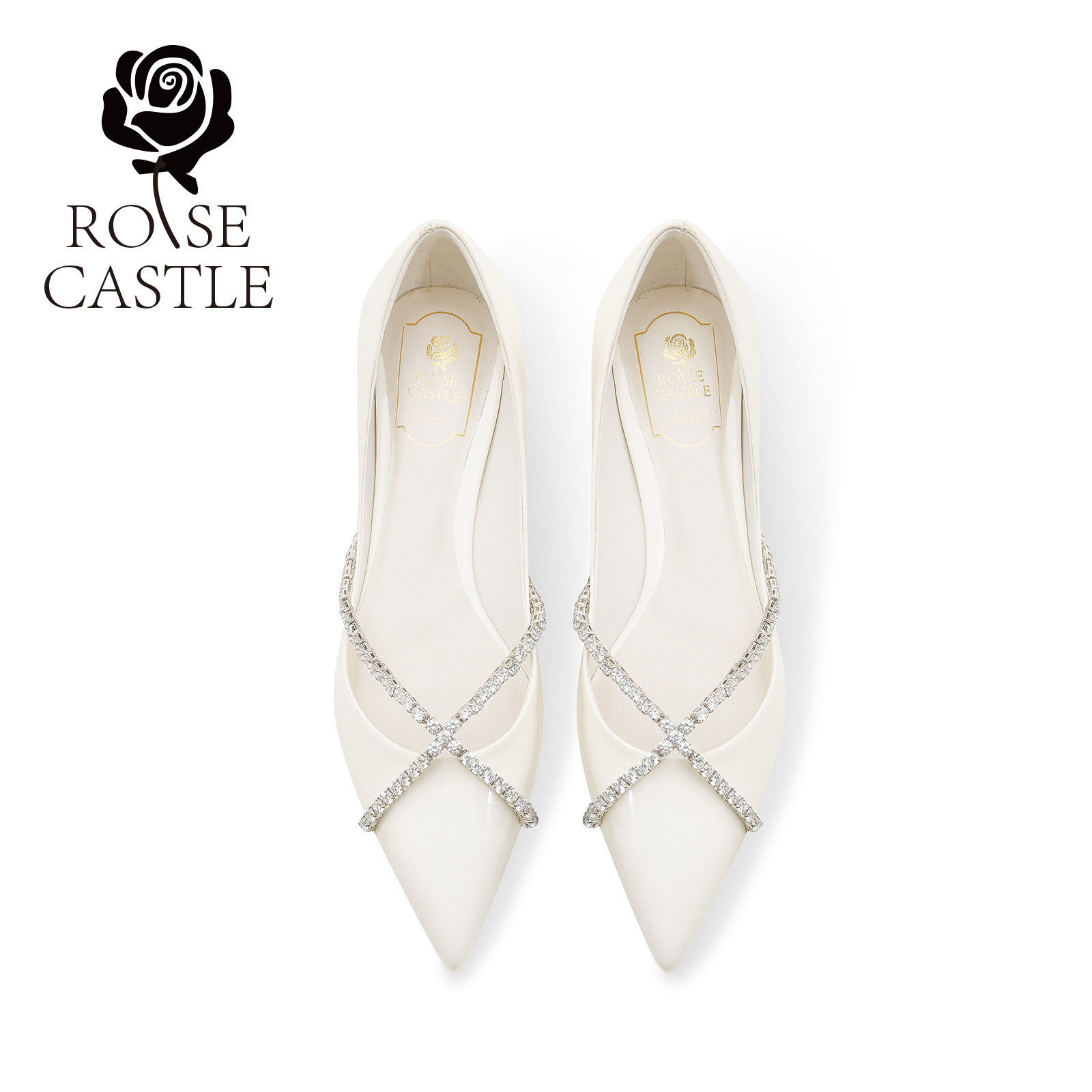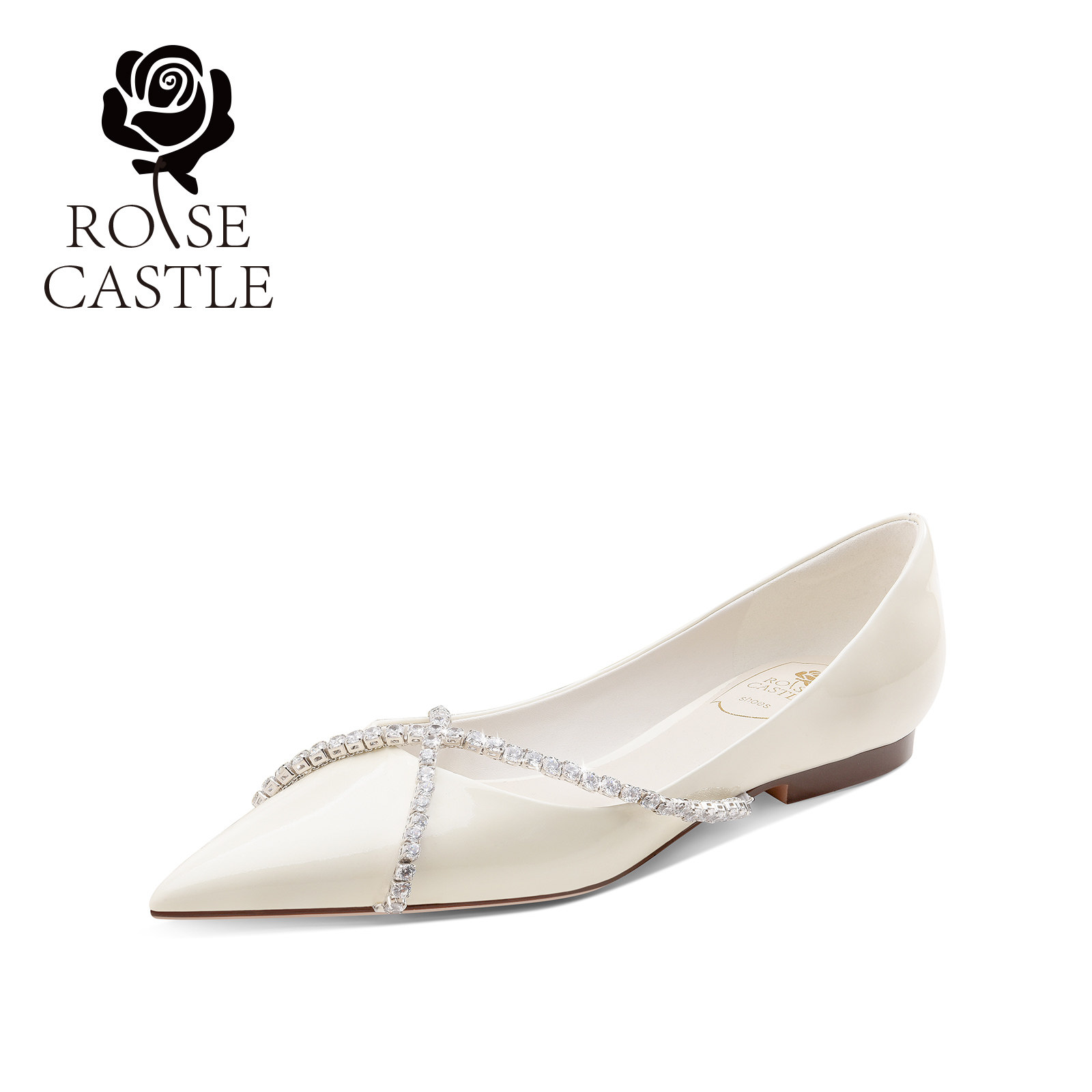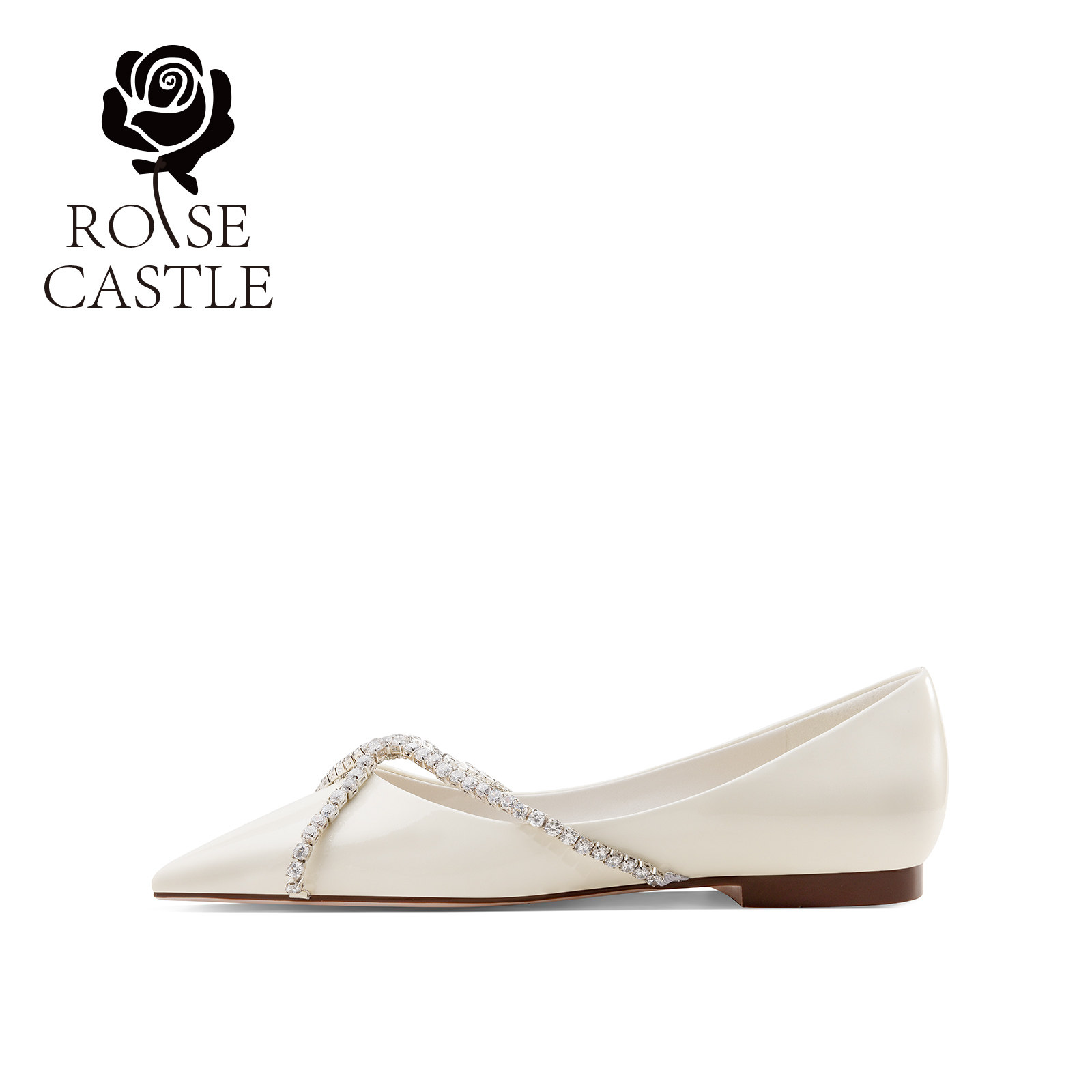 rose castle水晶链条芭蕾鞋浅口气质休闲鞋白色漆皮平底鞋婚鞋女