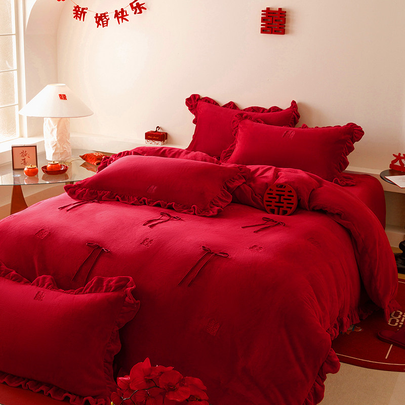 冬天牛奶绒婚庆四件套加厚保暖珊瑚绒欢喜刺绣红色结婚被套床单