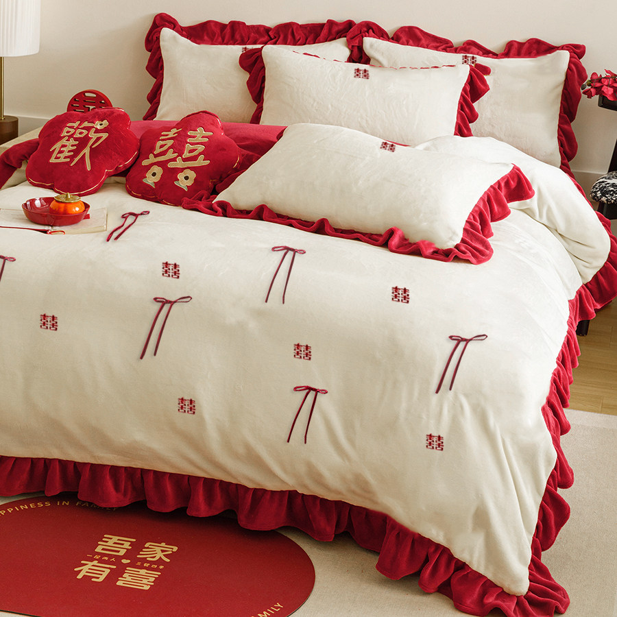 法式牛奶绒婚庆四件套加厚珊瑚绒被套刺绣冬季结婚床单床上用品