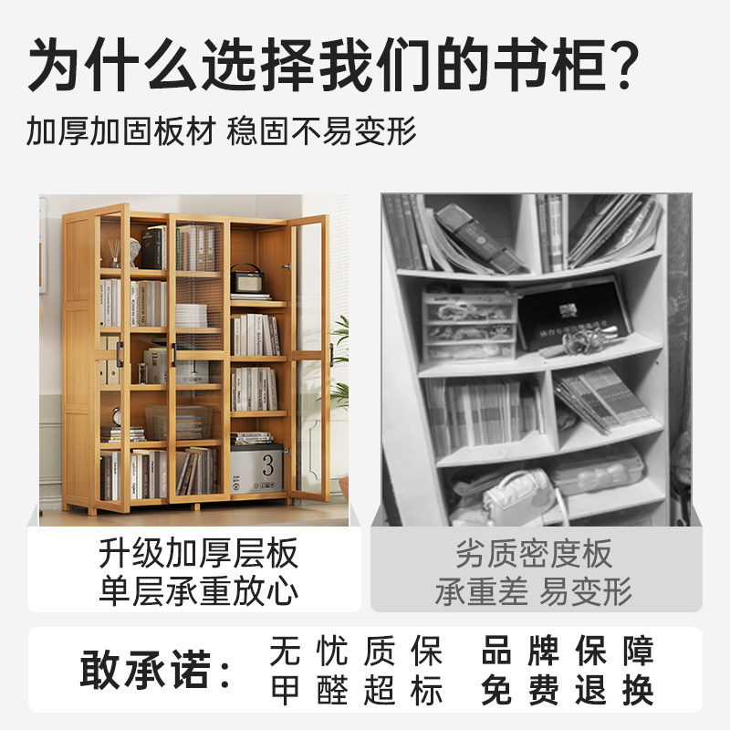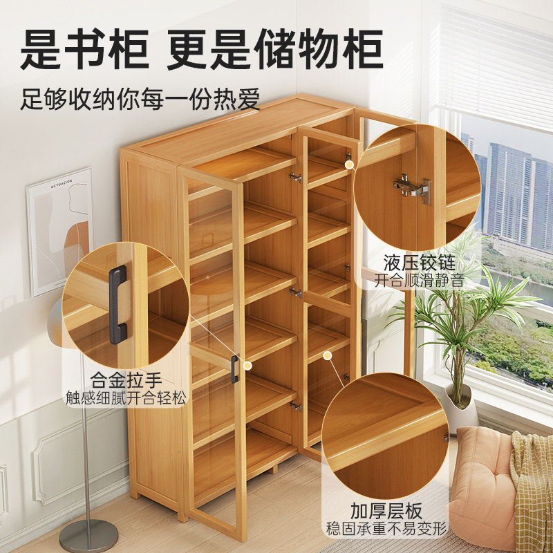 书架落地置物架家用实木书柜防尘带透明玻璃门一体靠墙储物收纳柜