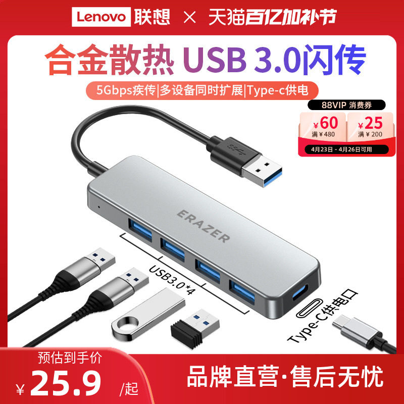 联想生态品牌异能者高速usb扩展器分线器USB3.0多口typec供电长线拓展坞集线器联想小新笔记本电脑转接头