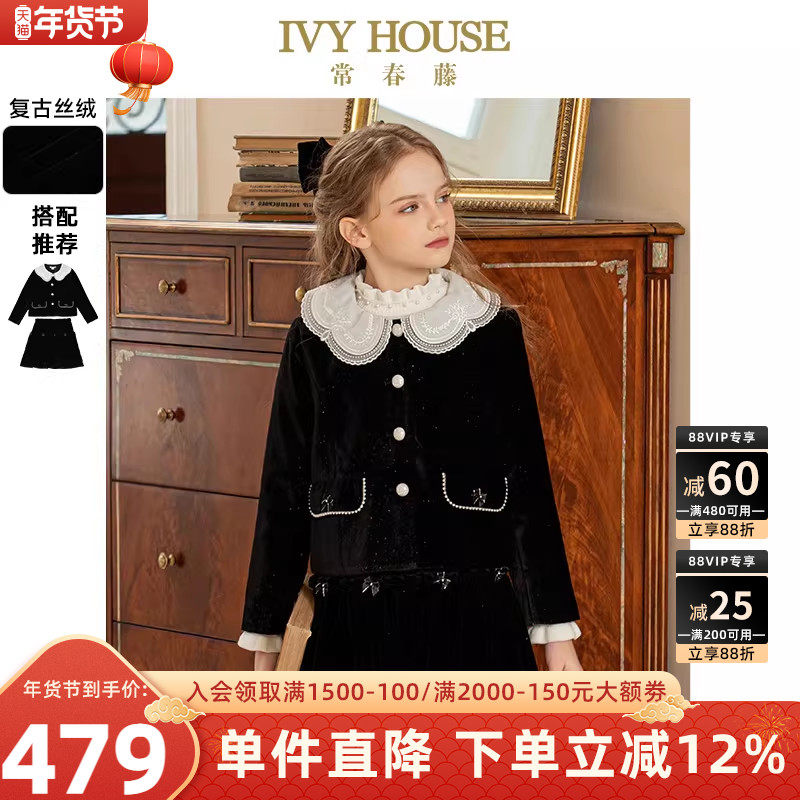 IVY HOUSE常春藤童装女童冬季新款 法式小香风丝绒外套半身裙套装