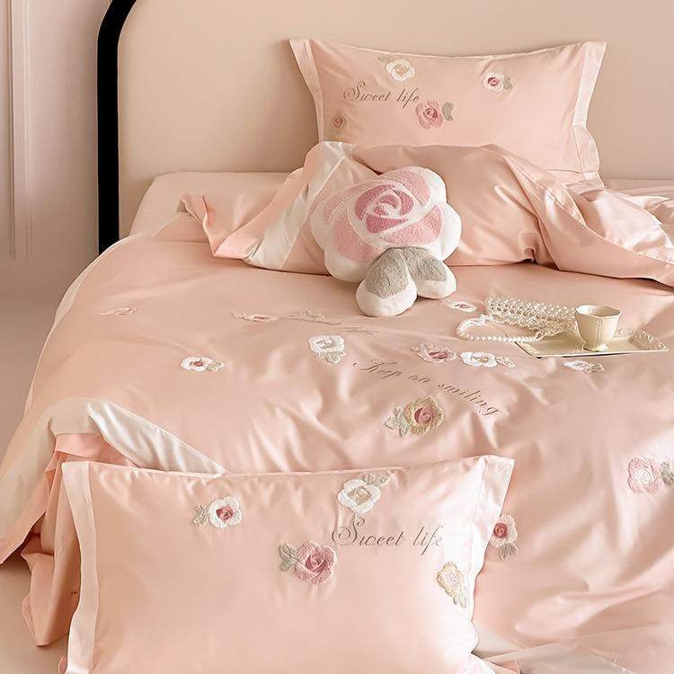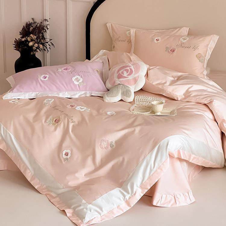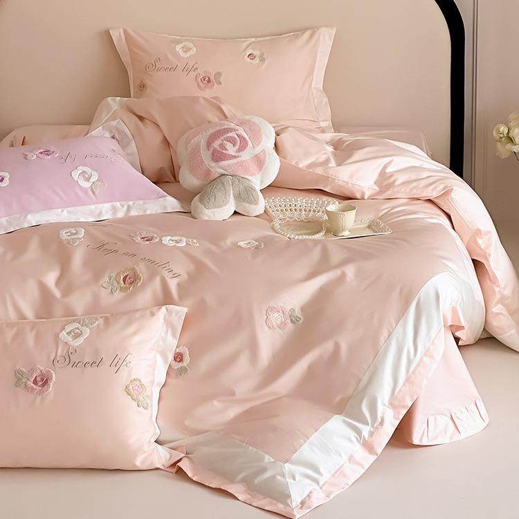 清新少女风100支长绒棉四件套纯棉贡缎被套全棉立体花朵毛巾绣1.8