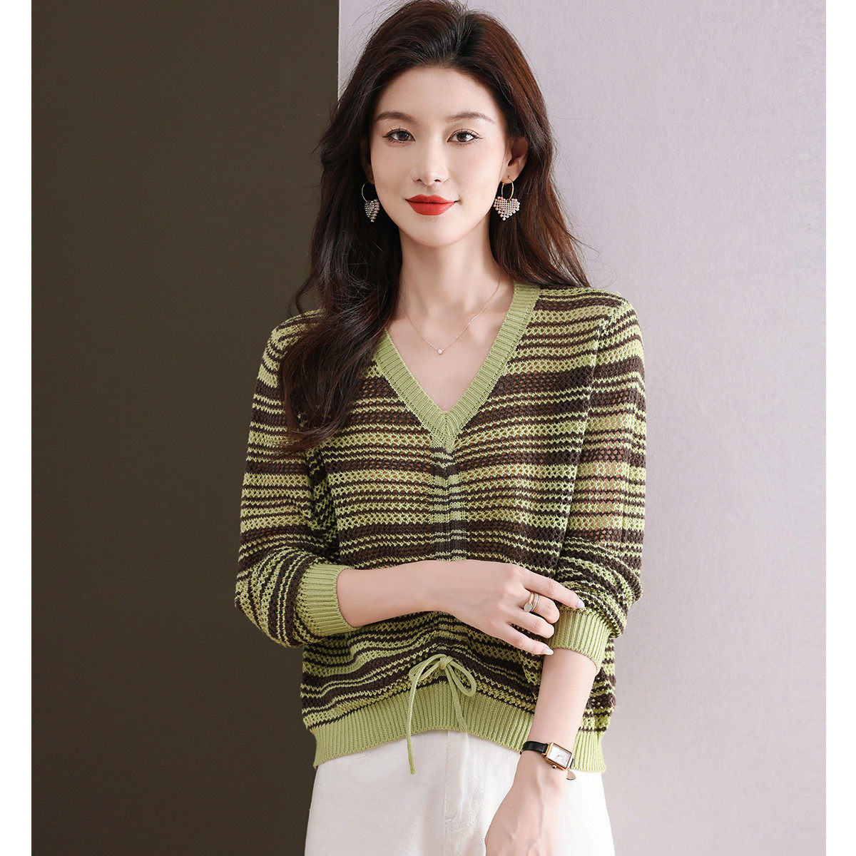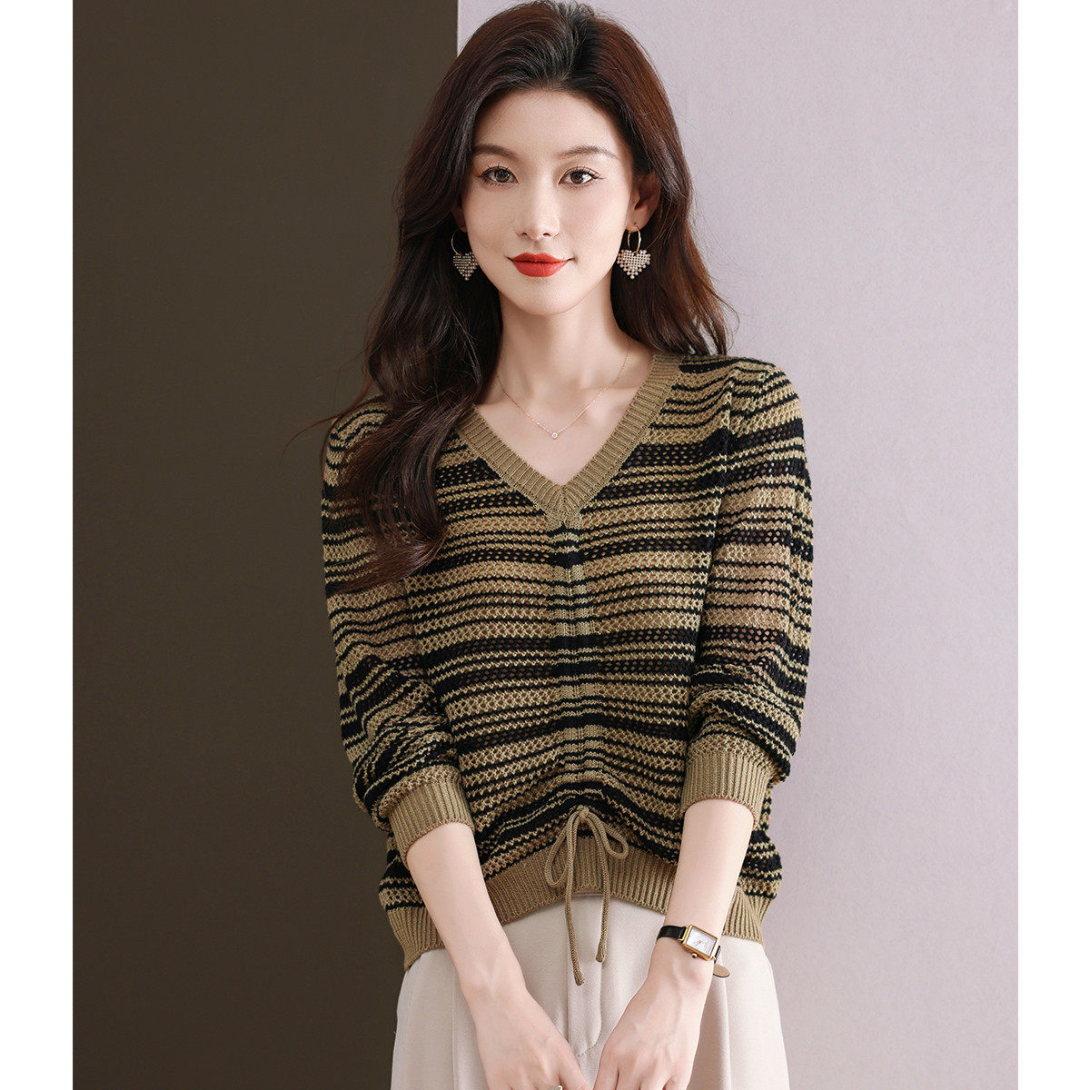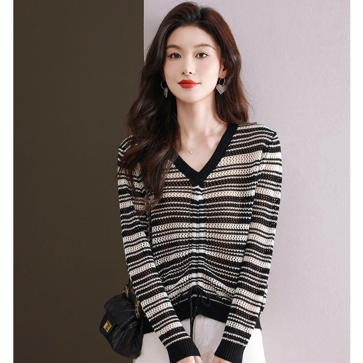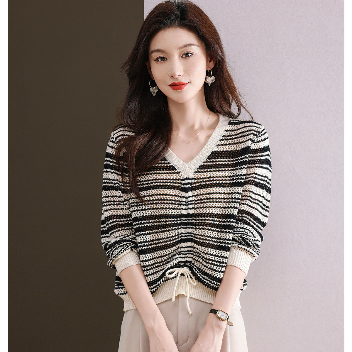 2026气质V领女装上衣春季撞色打底毛衣女温暖舒适套头针织衫