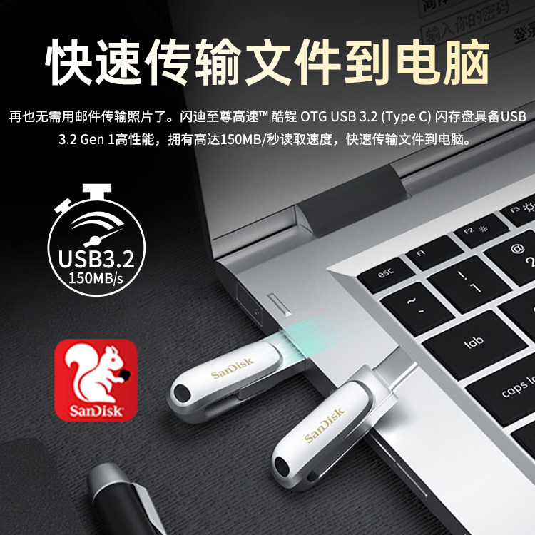 闪迪typec手机u盘32g高速电脑ipad两用双接口usb3.2金属加密优盘