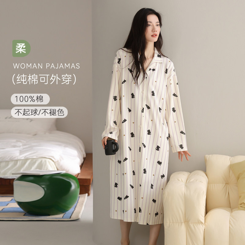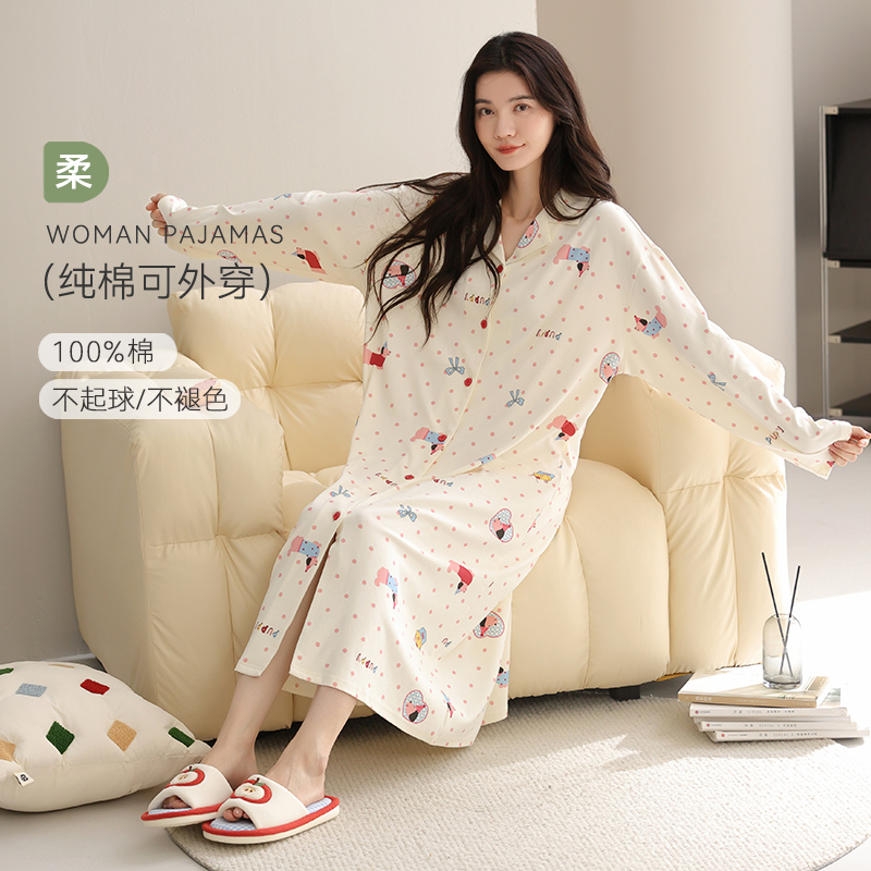 帕兰朵长款睡裙春秋季纯棉全棉睡衣孕妇长袖家居服秋冬款可外穿