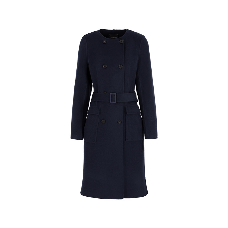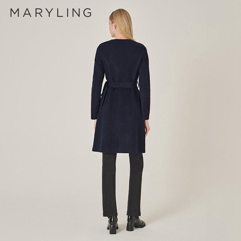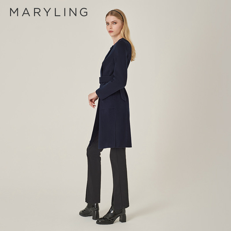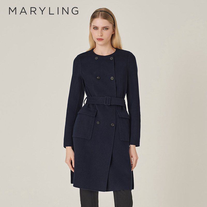 MARYLING玛俪琳初冬新品深蓝色无领双排扣大衣外套A1EHW93580