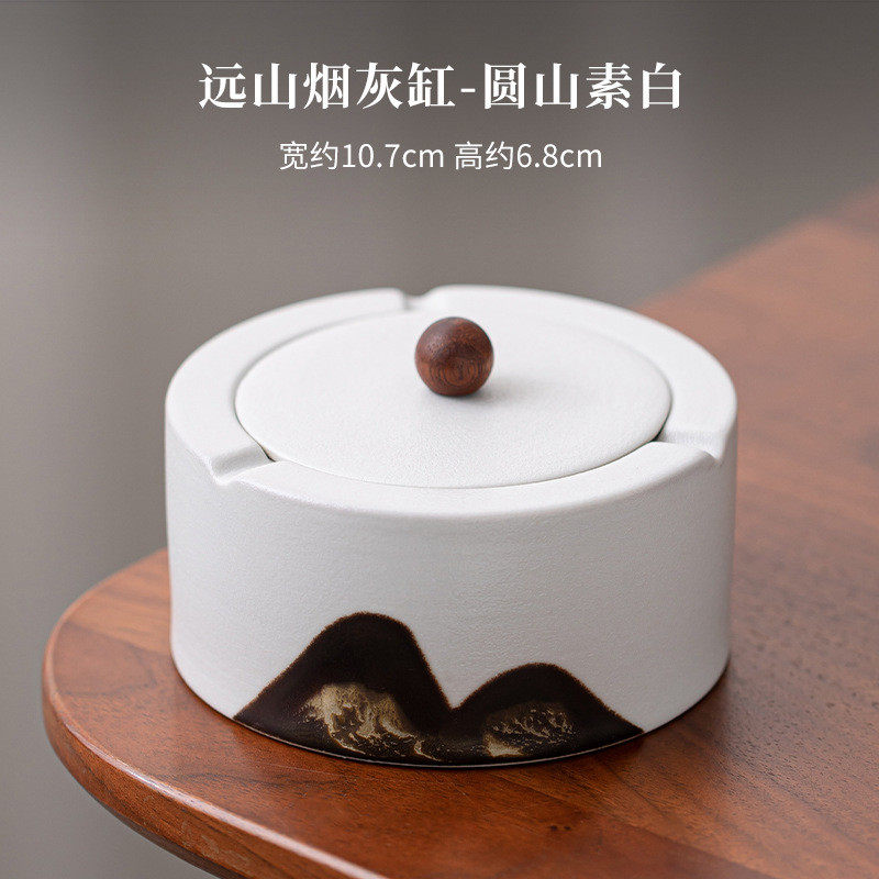 远山圆山带盖烟缸防风防飞灰家用客厅办公室简约陶瓷烟灰缸摆件