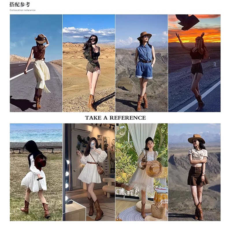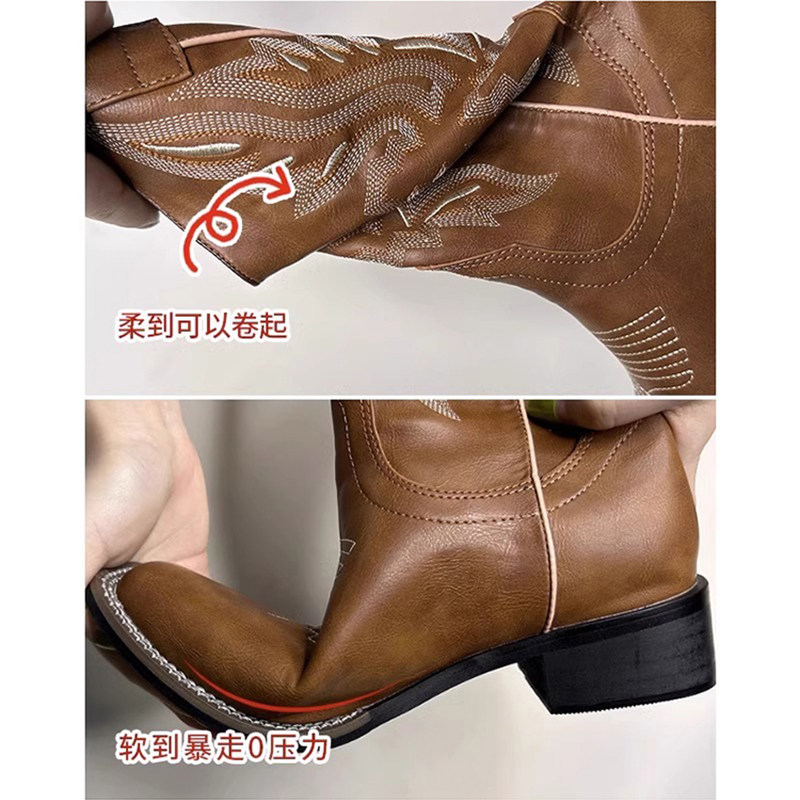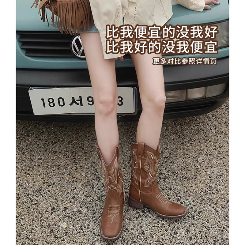 何穗同款西部牛仔靴女骑士靴子春秋季民族风长筒靴马丁靴高筒中跟