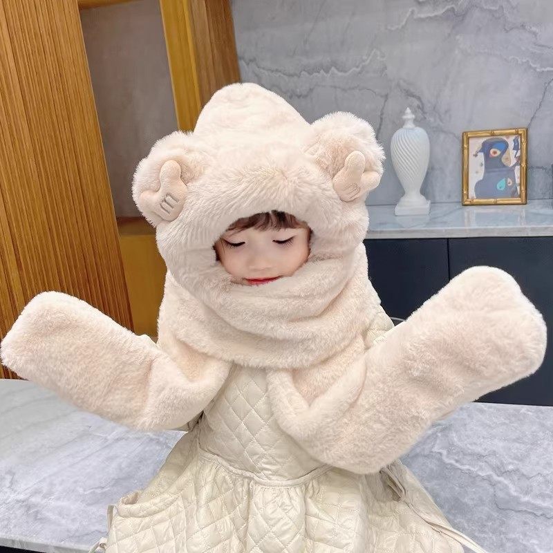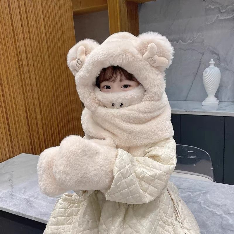 儿童帽子秋冬季保暖围巾一体帽男女童口罩手套毛绒帽加绒时尚洋气