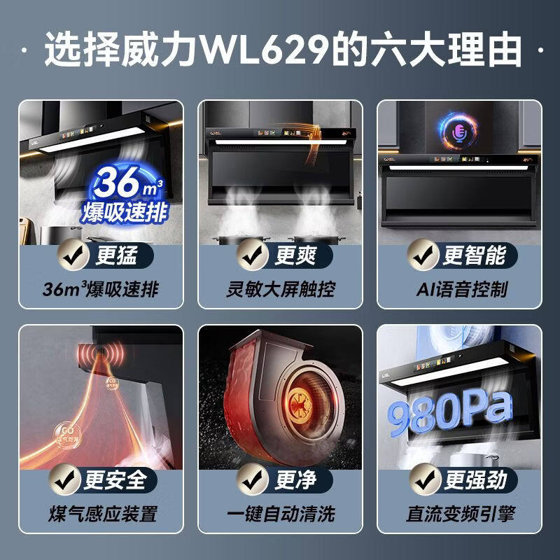 威力抽油烟机家用大吸力顶侧双吸自动清洗一级能效变频吸油烟机