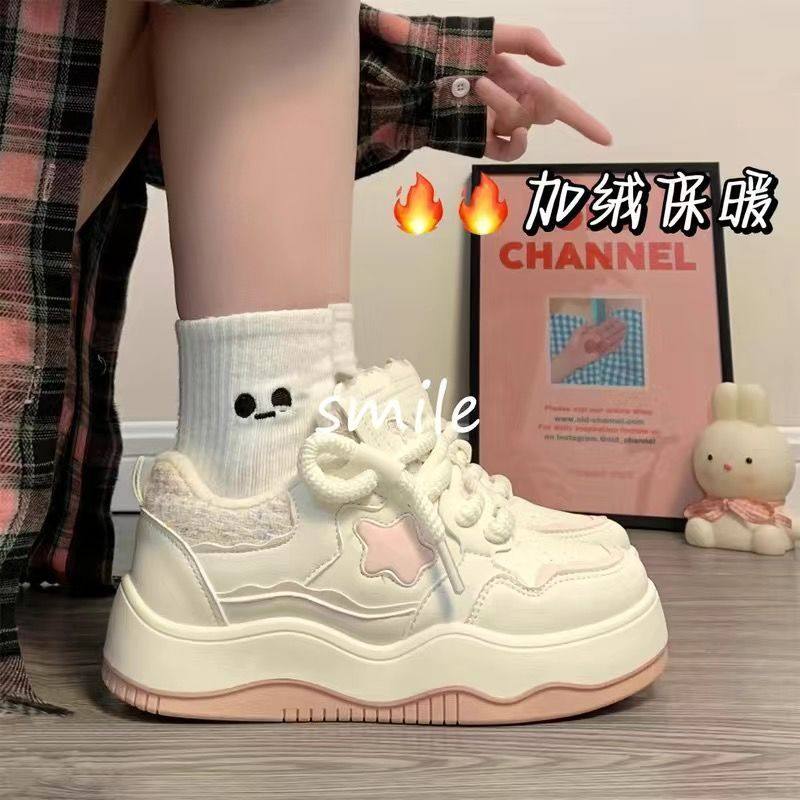 甜美可爱加绒厚底星星板鞋女冬季保暖百搭休闲学生系带增高小白鞋