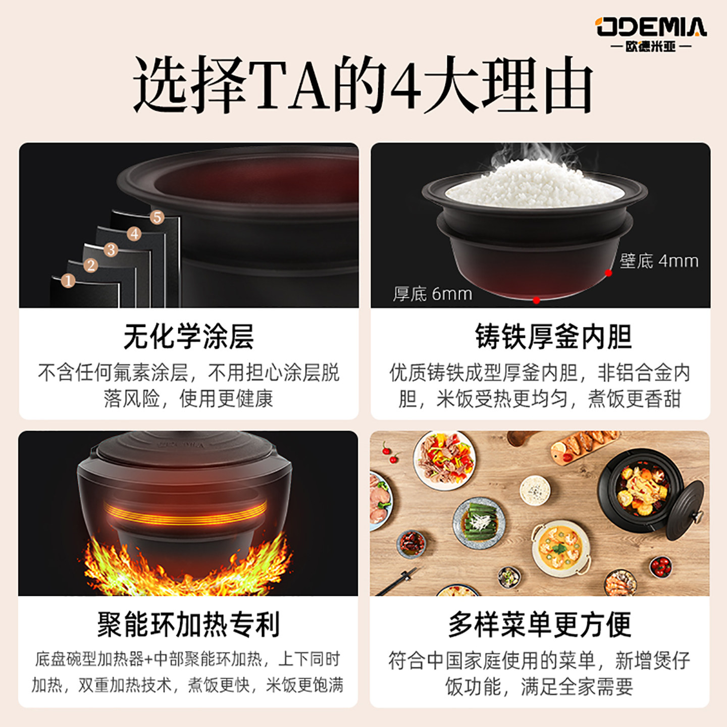 欧德米亚铸铁锅电饭煲迷你家用2-4人5-6无涂层智能预约柴火饭锅3L