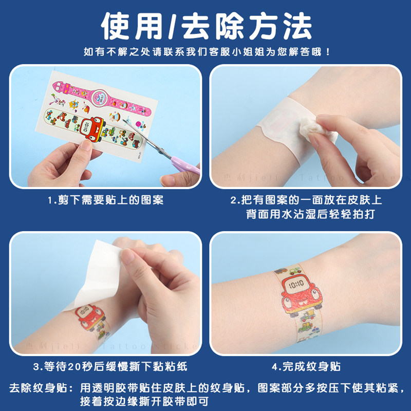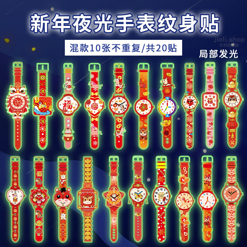 杰利新年夜光手表贴纸女孩儿童男孩贴画奖励手链纹身贴学生可洗安全防水马年福字锦鲤水转印玩具生日实用礼物