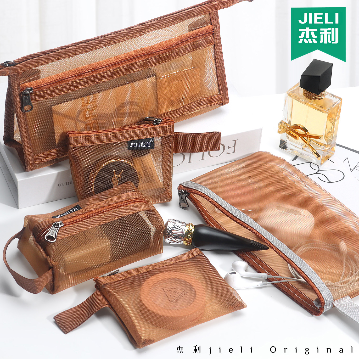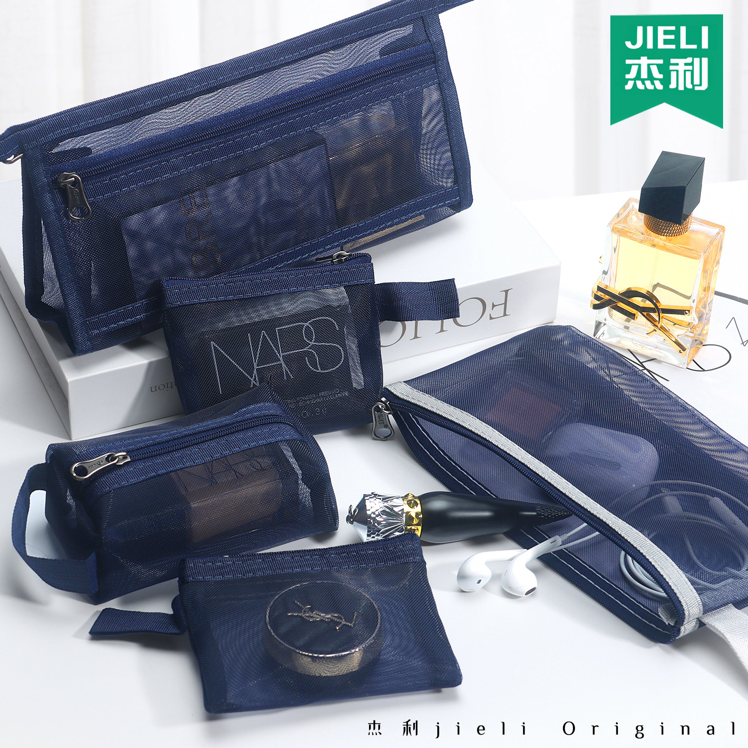 杰利网纱收纳袋套装化妆小袋便携学生透明拉链袋女生高颜值收纳小袋口红银行卡包身份证钥匙包充电线耳机袋
