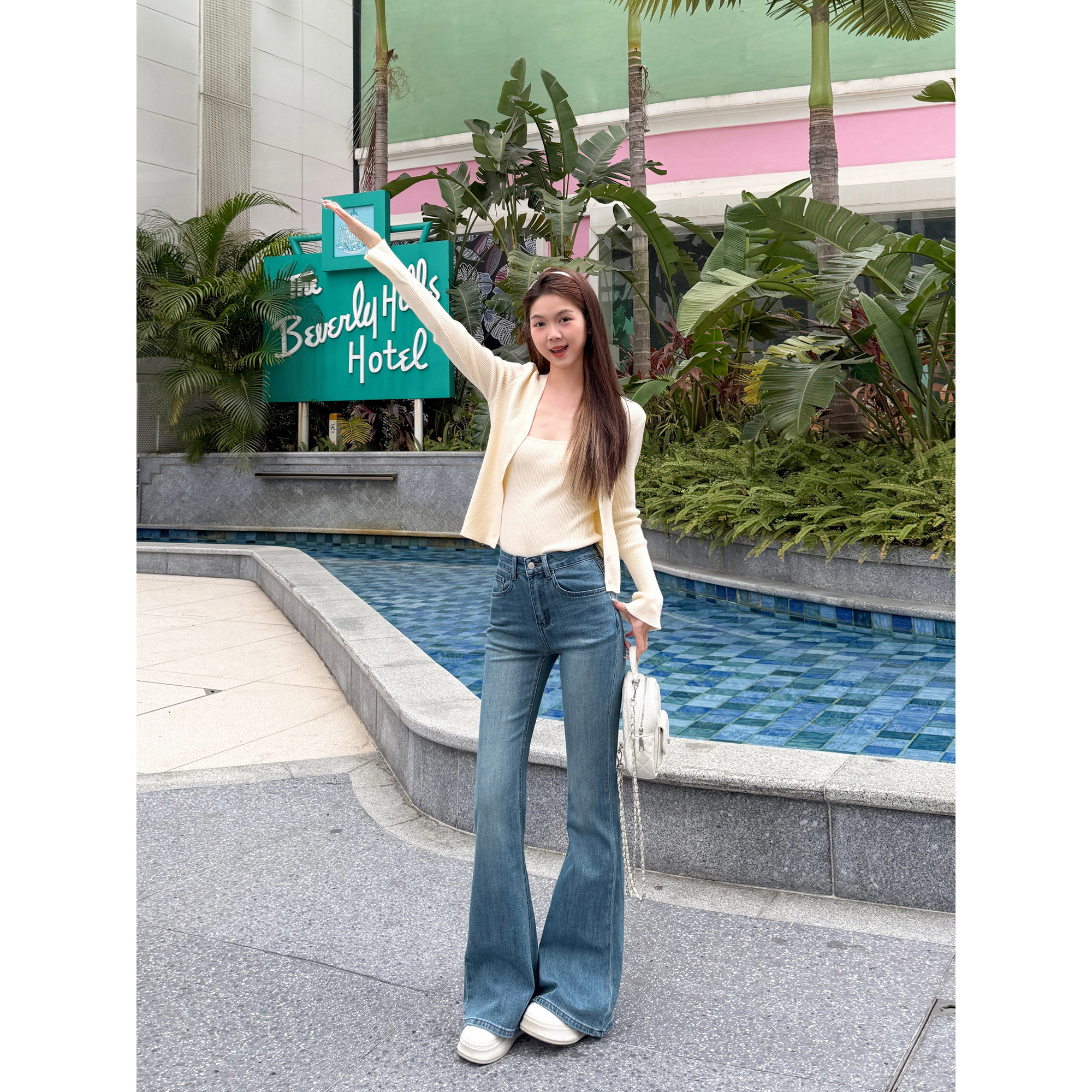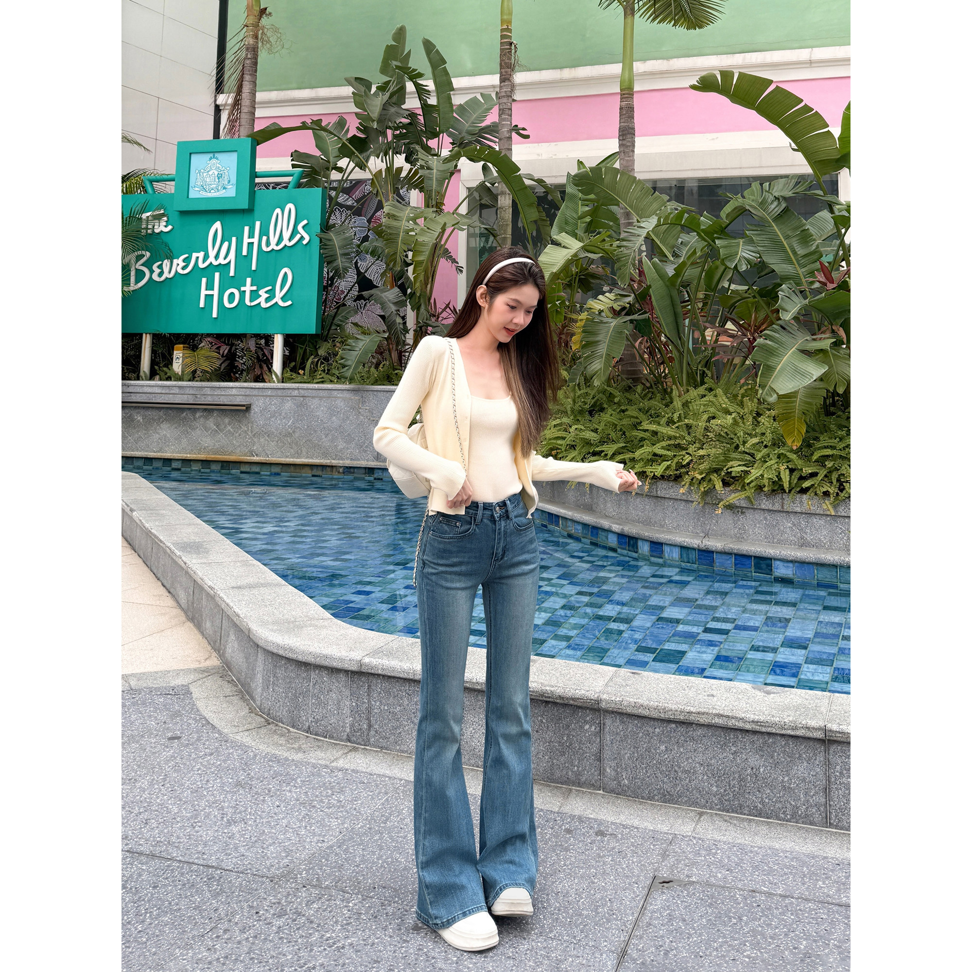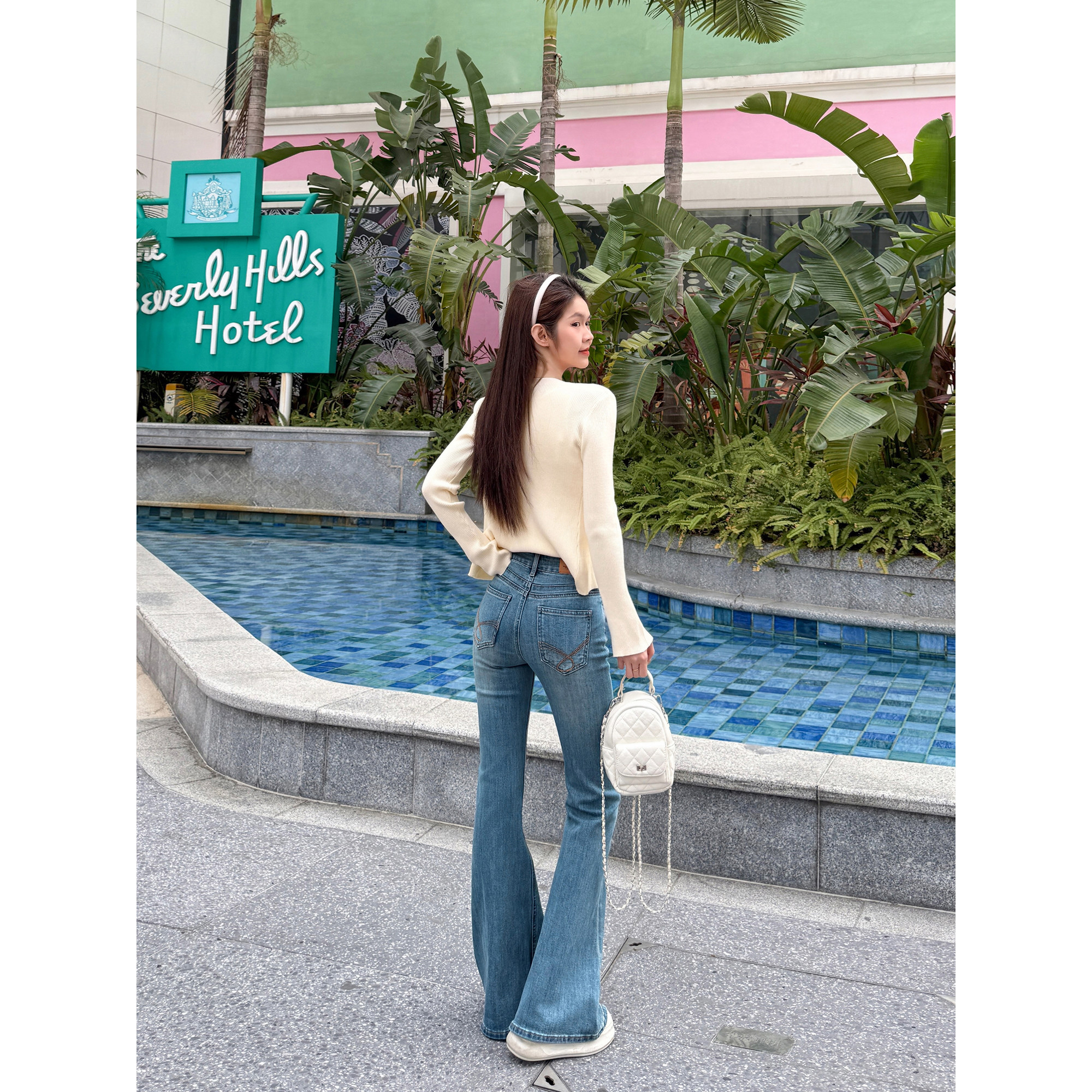 王家有鱼秋季新款2025复古蓝微喇牛仔裤中高腰不贴腿显瘦裤子女款