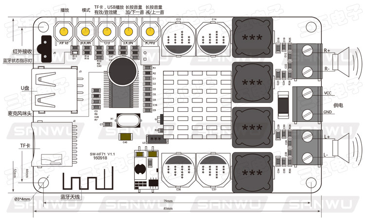 蓝牙接收 U盘 TF卡解码带遥控数字功放板 TPA3116 2X50W HF183