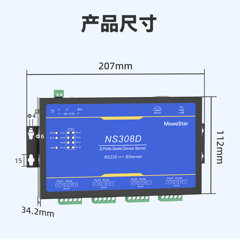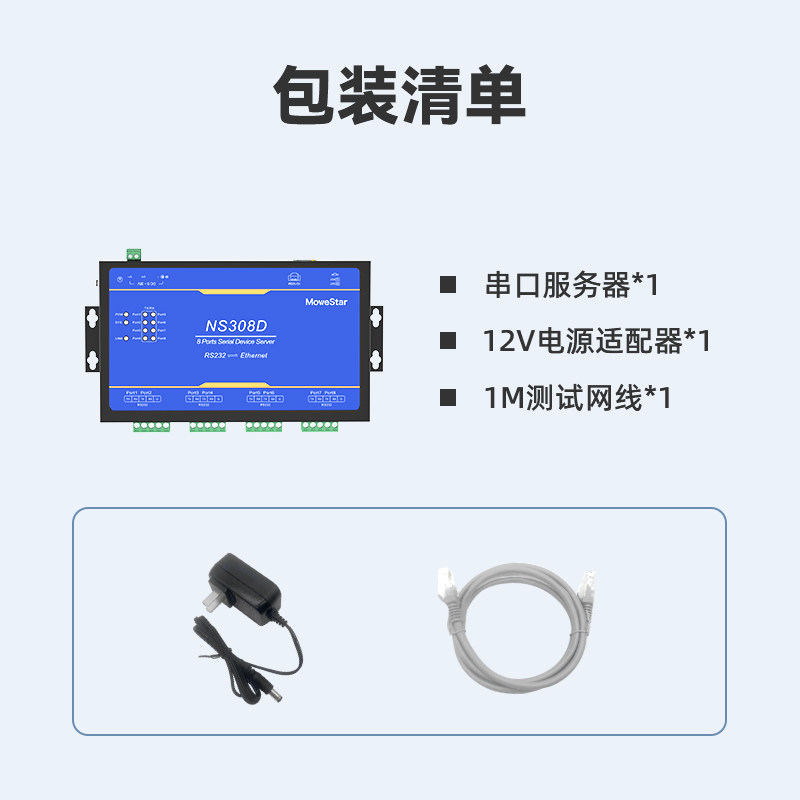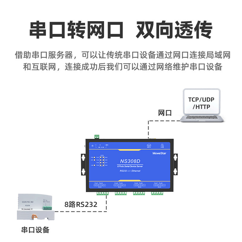 【MoweStar】移星工业级串口服务器8口RS232转以太网转RJ45网口模块ModbusTCP桌面式物联网通讯网关NS308D