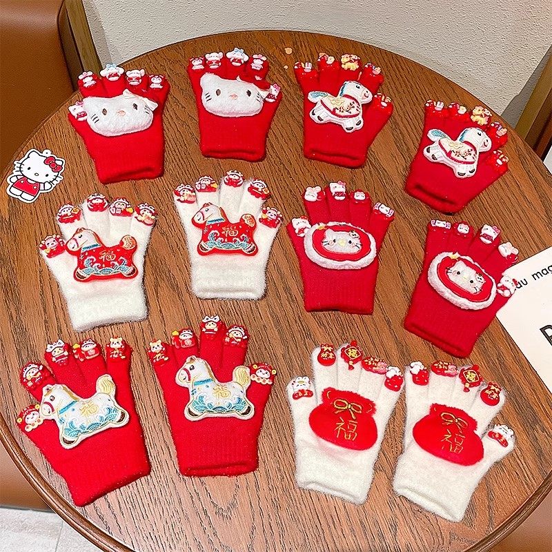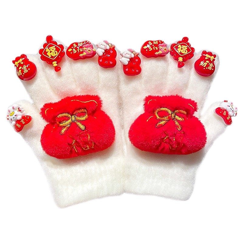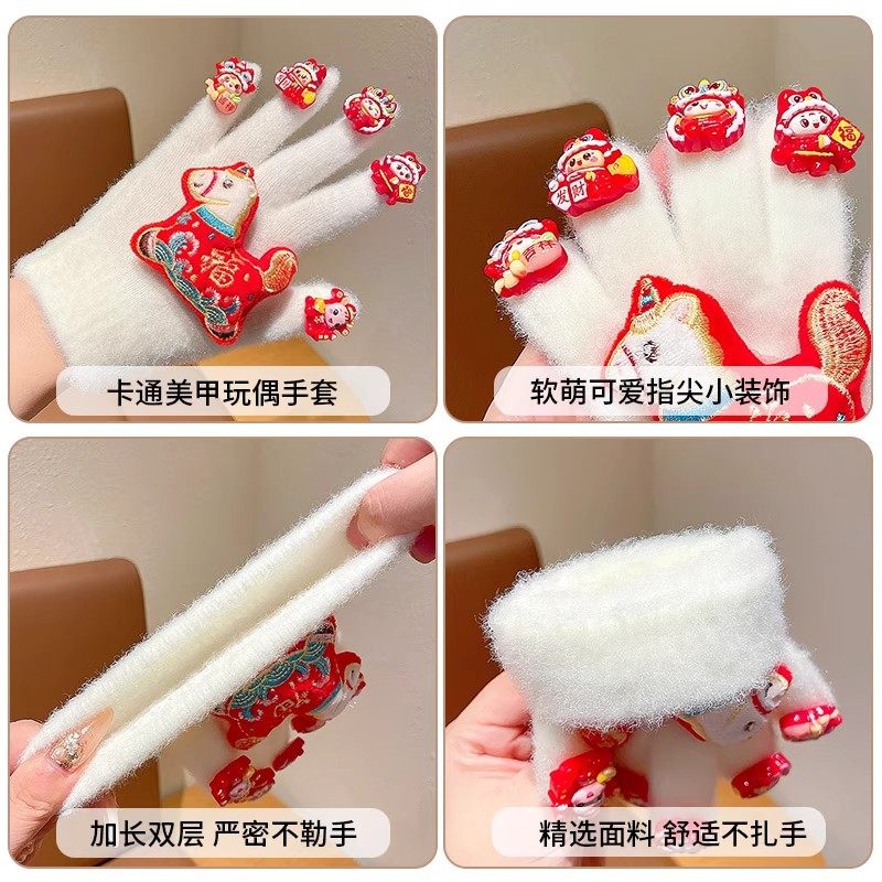 儿童冬季新年红色手套女童可爱马年加绒五指套宝宝保暖分指套美甲
