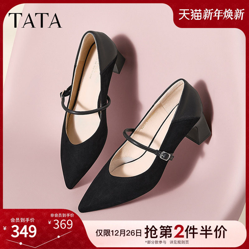 TATA他她女鞋粗跟玛丽珍鞋黑色高跟鞋小皮鞋2025羊皮单鞋XGM01AQ5