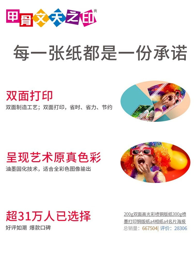 甲骨文天之印a3双面照片相片纸a4喷墨铜版纸打照片专用纸相纸打印纸打印机6寸铜板纸高光彩喷白卡rc相纸300g