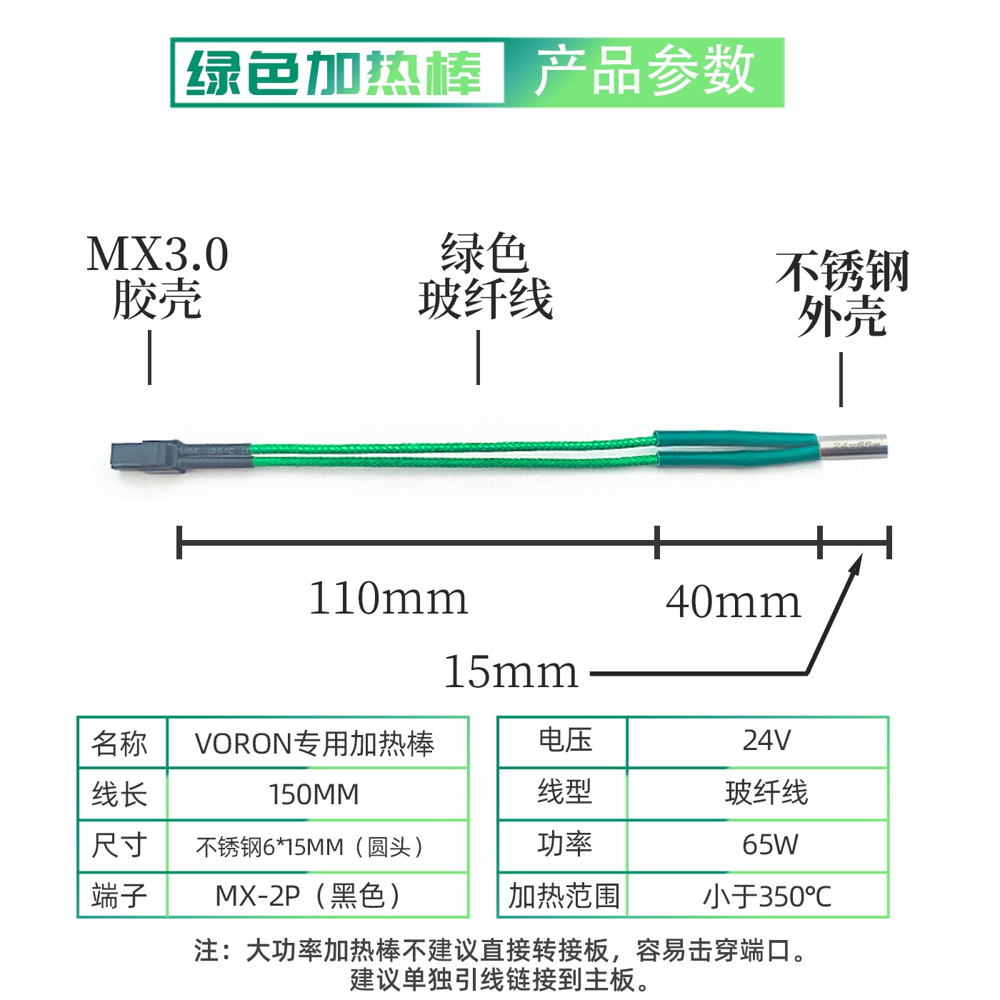 草原绿 加热棒 大功率 24V 50/65W 加热管φ6mm×15mm 线长15CM