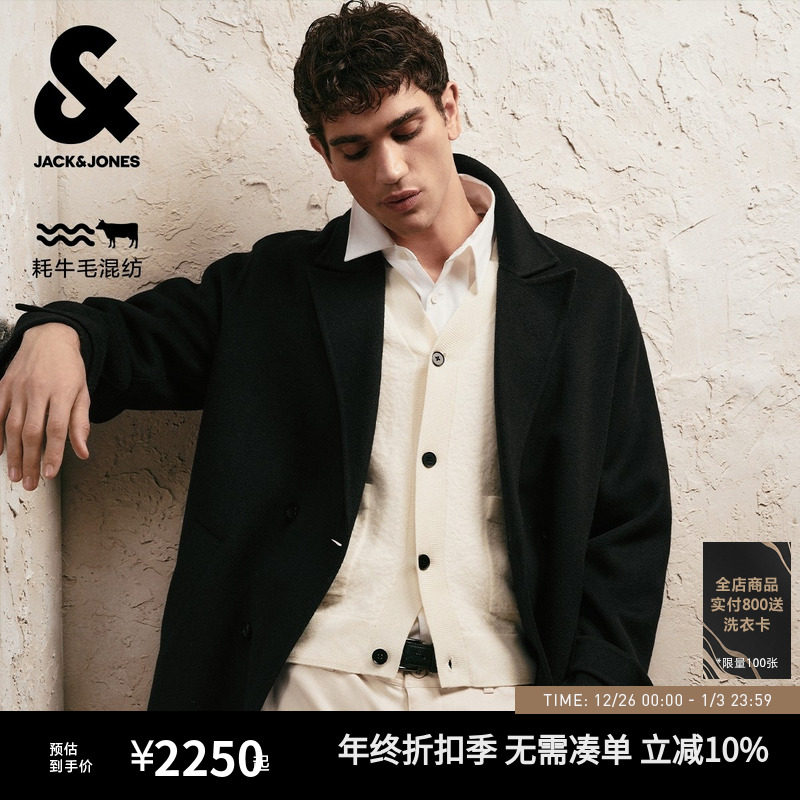 杰克琼斯男装秋冬毛呢大衣2025年秋冬黑色长款平驳领潮流外套