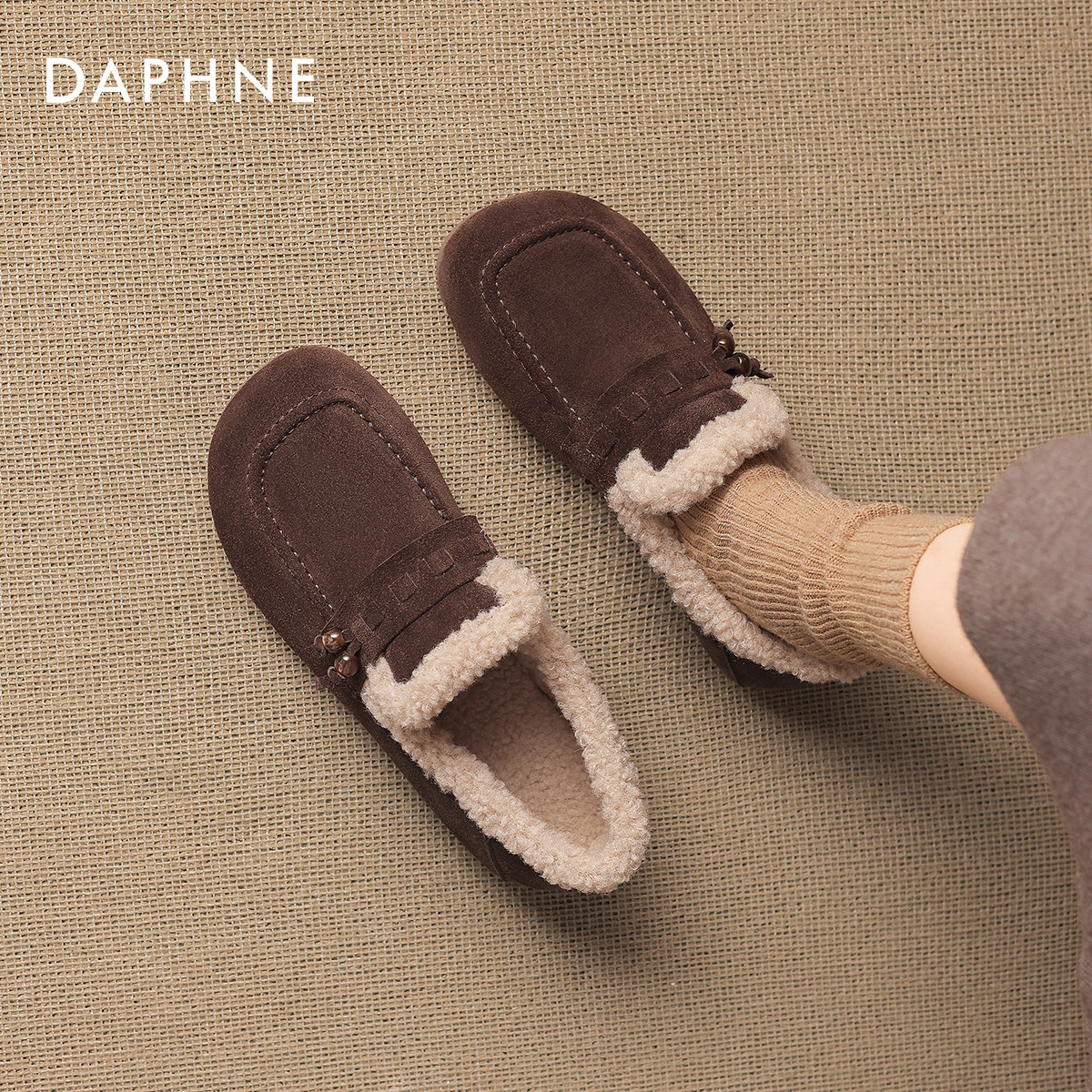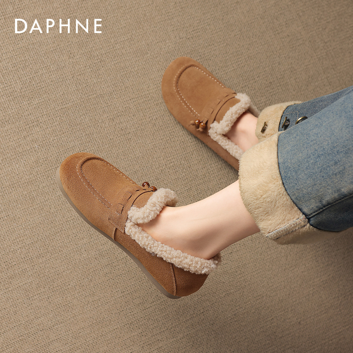 达芙妮加绒乐福鞋女2025新款冬季保暖外穿毛毛鞋勃肯棉鞋豆豆鞋女