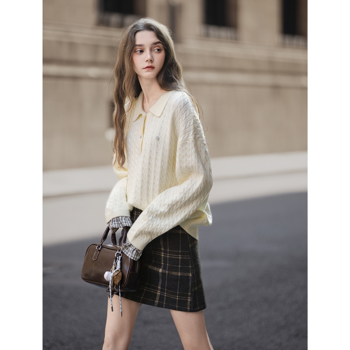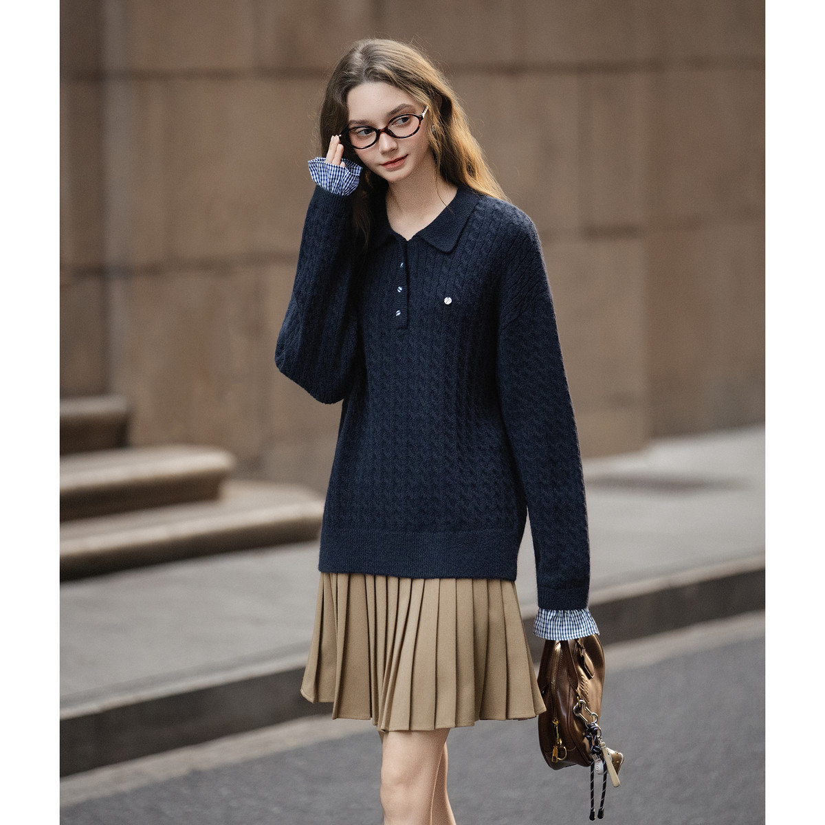 唐狮秋冬季女POLO领净色绞花袖口拼接假两件毛线衫超好看上衣TU