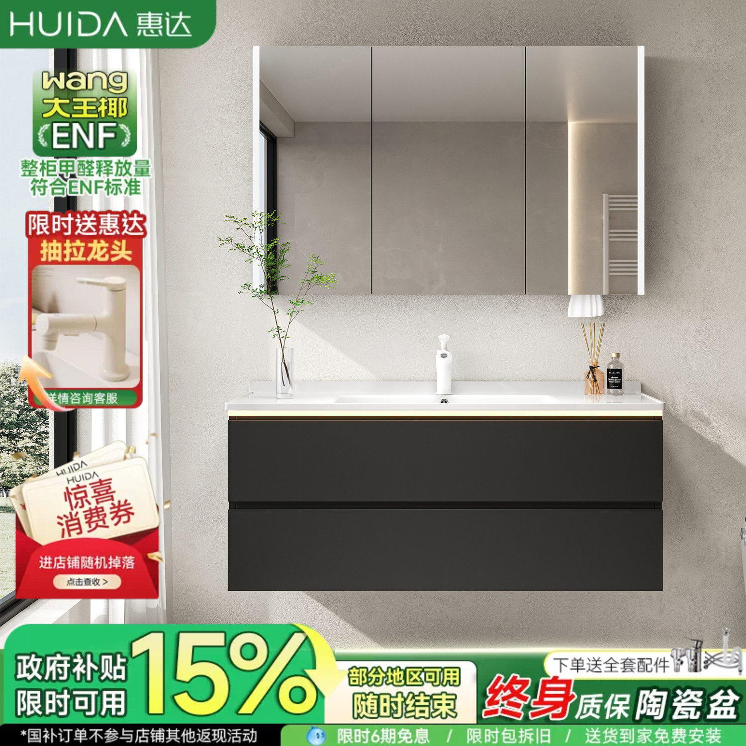 惠达黑色浴室柜陶瓷一体盆现代简约卫生间洗手洗脸盆柜组合洗漱台