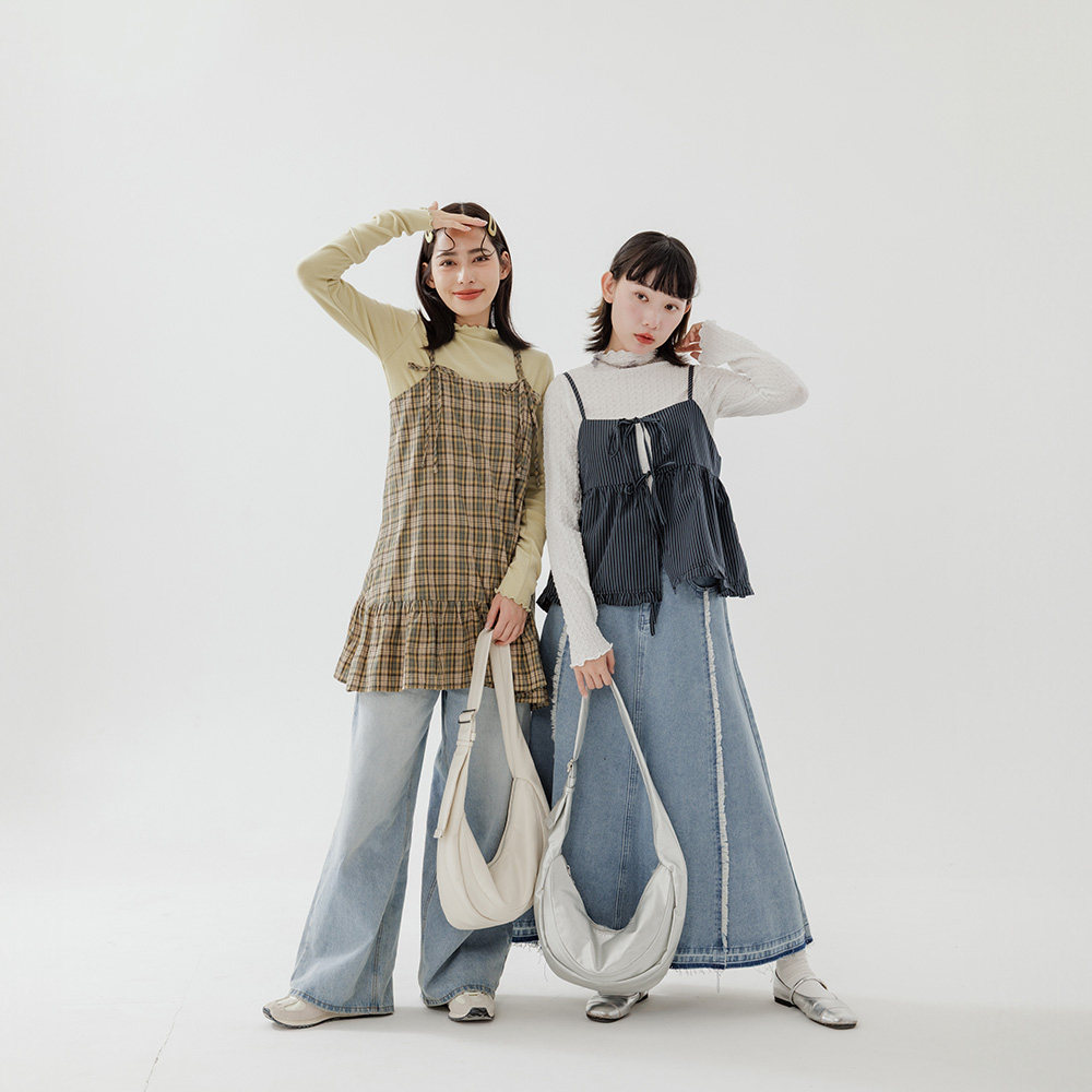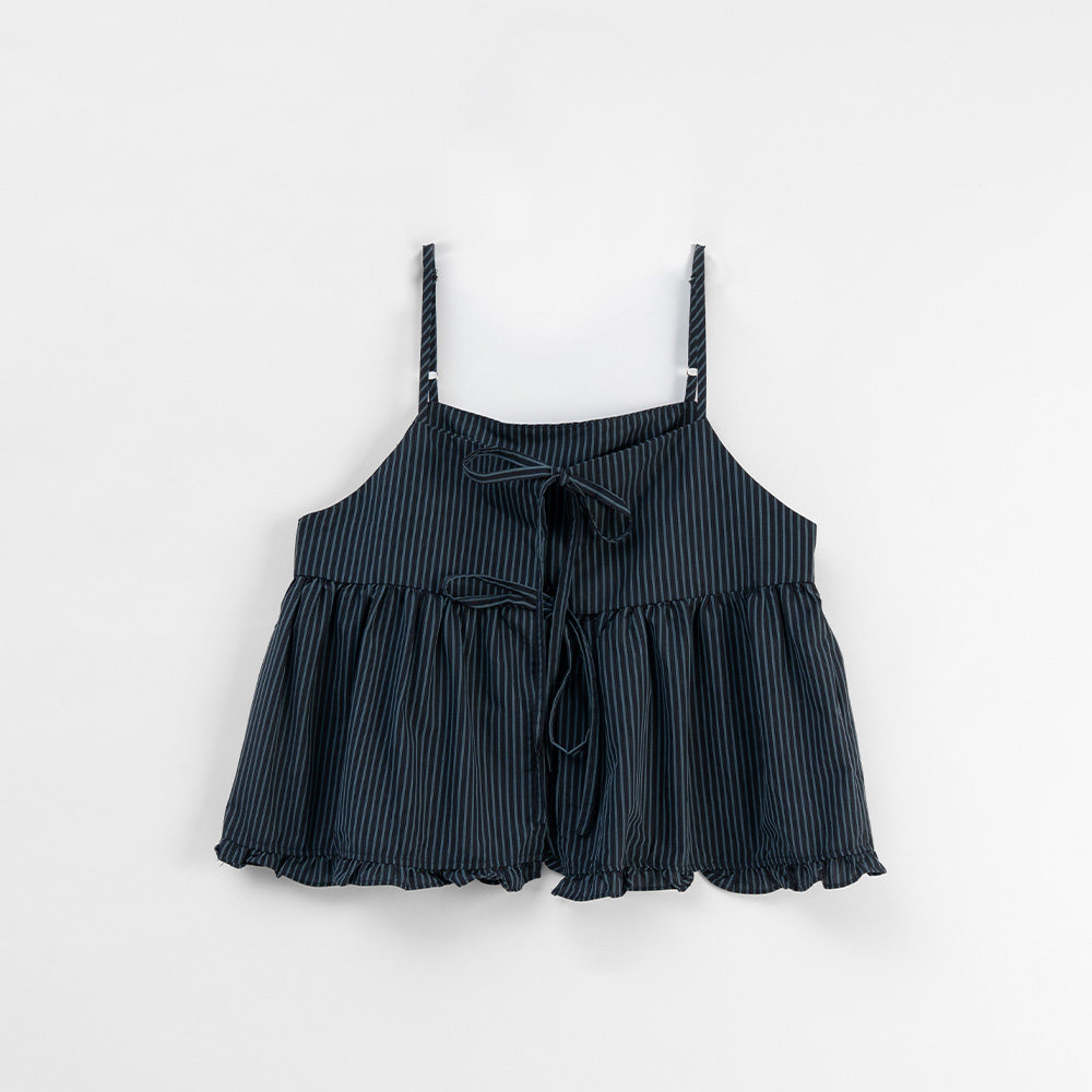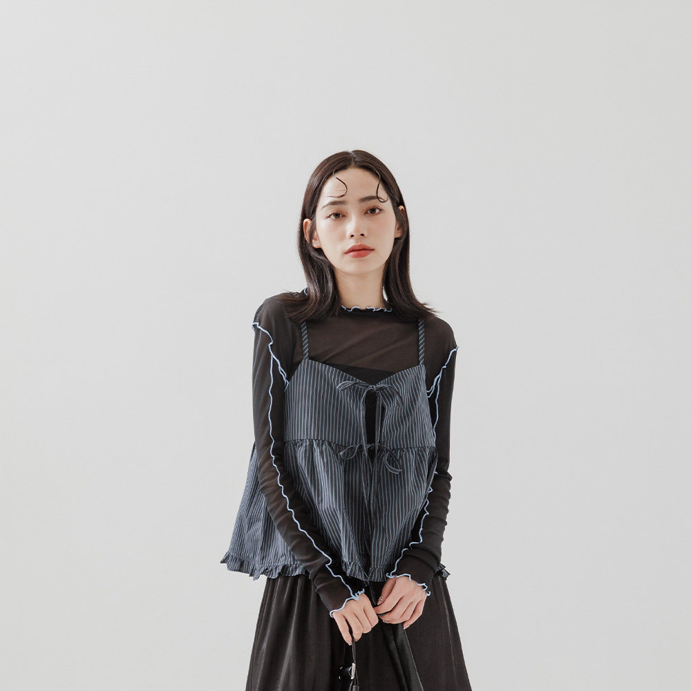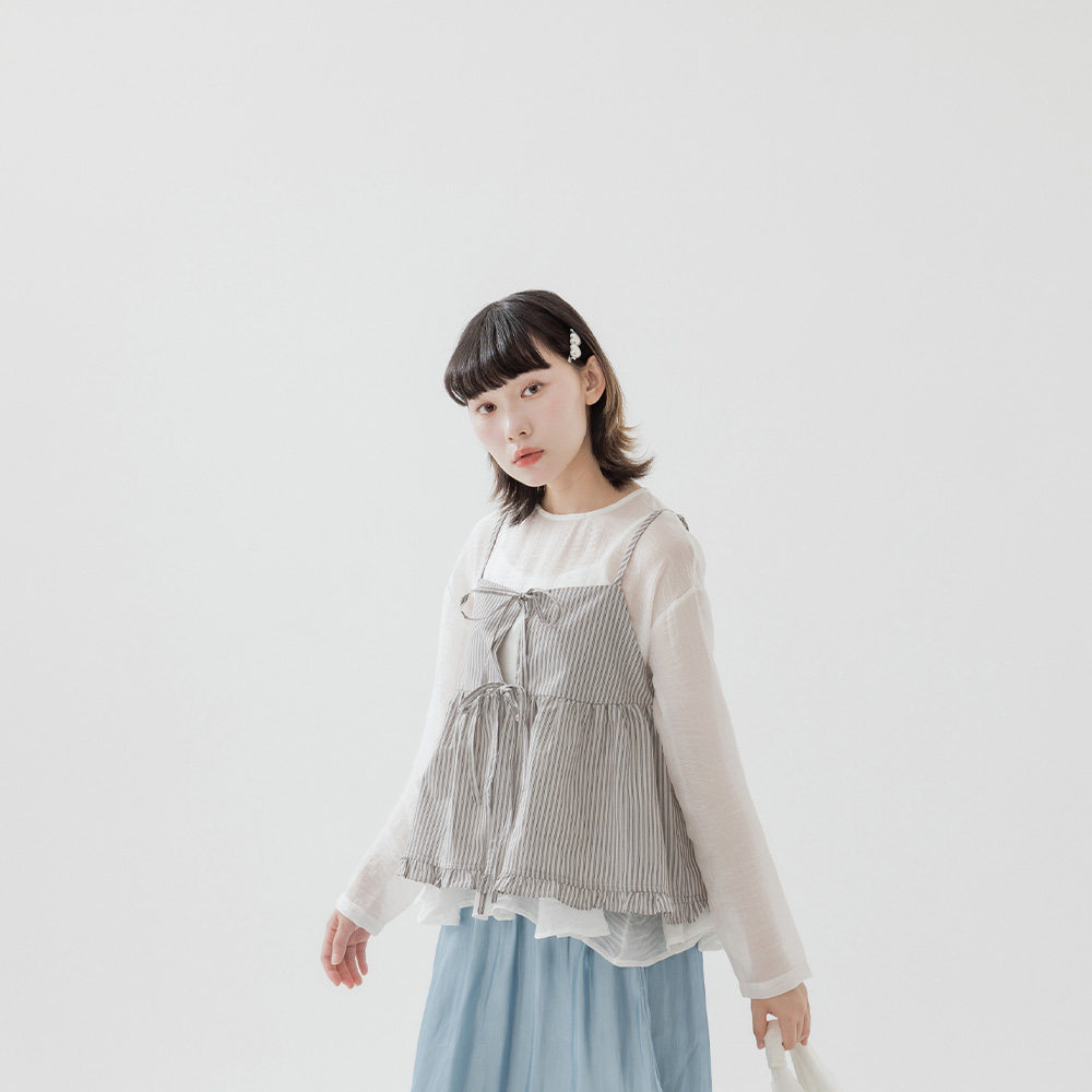 QUEENSHOP 2025秋冬新品女装条纹荷叶边绑带细肩罩衫背心01099391