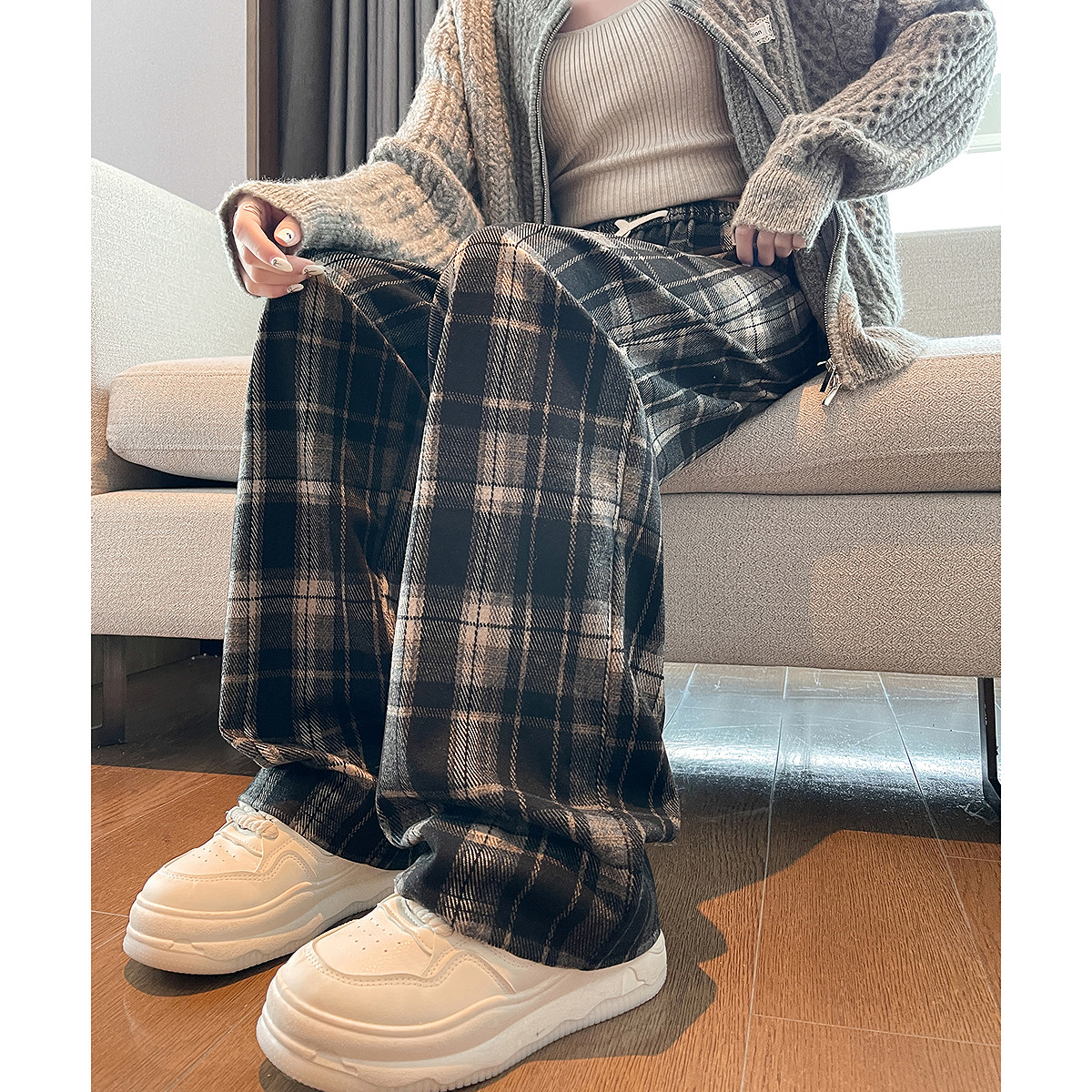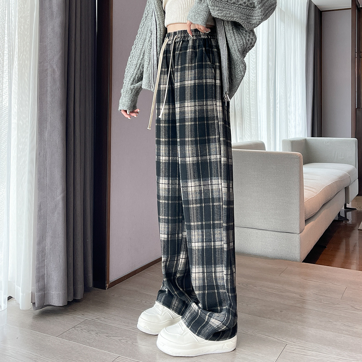 唐狮秋冬季新款女休闲裤流行百搭直筒阔腿黑色显瘦格子长裤WPTD