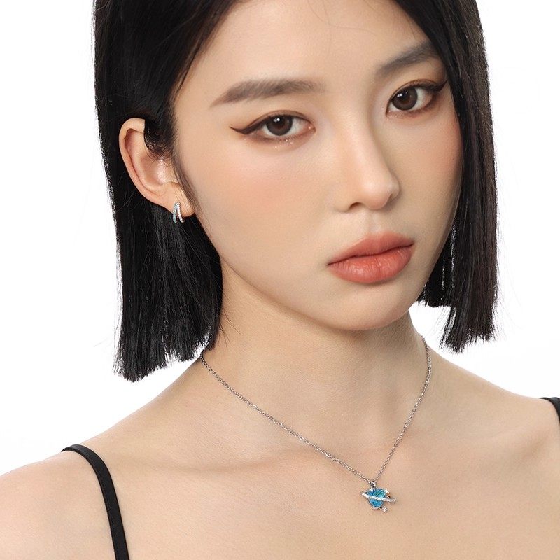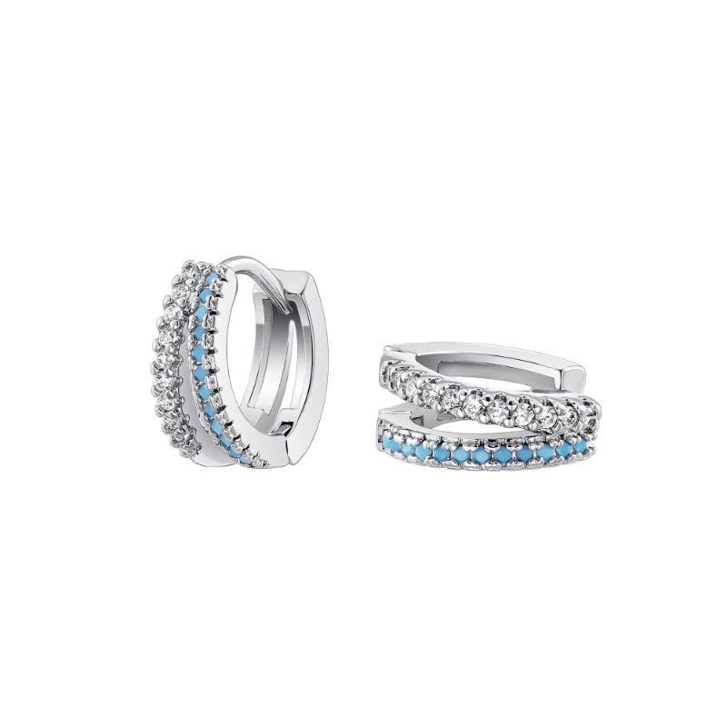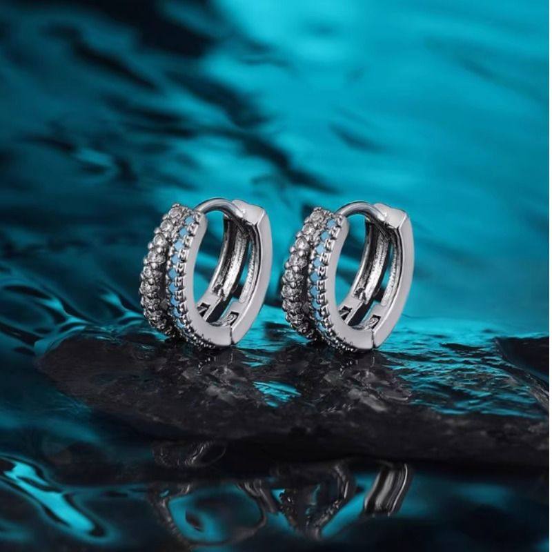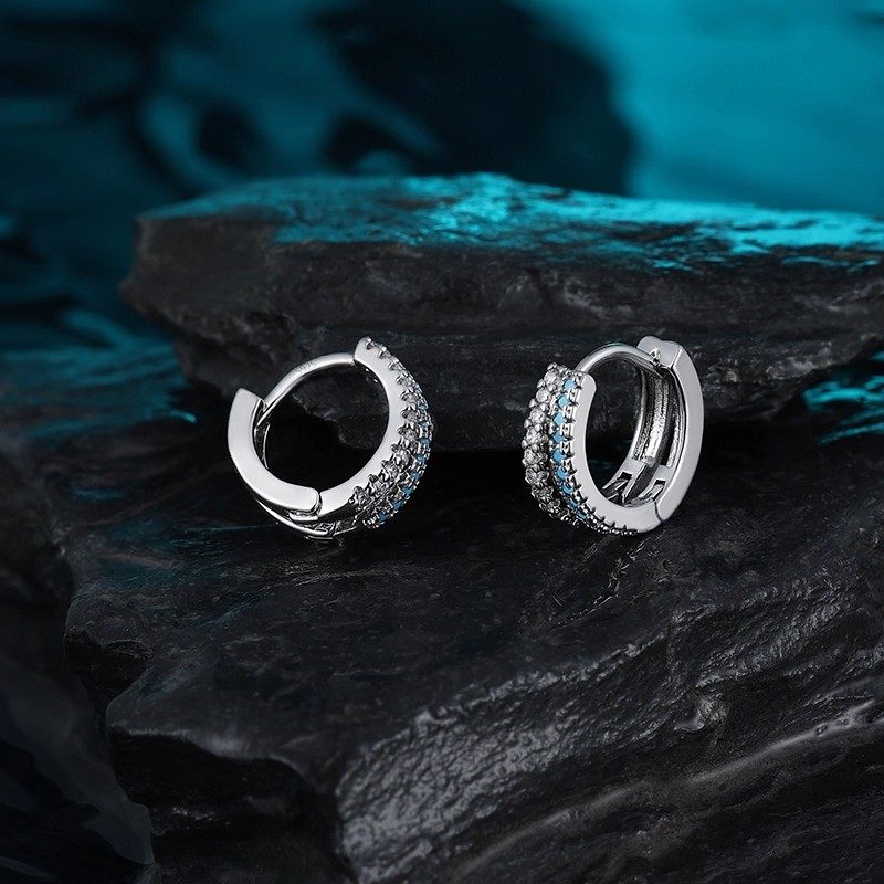 蓝色S925银针双层素圈耳环女人工锆石耳圈耳扣耳骨钉耳钉秋冬耳饰