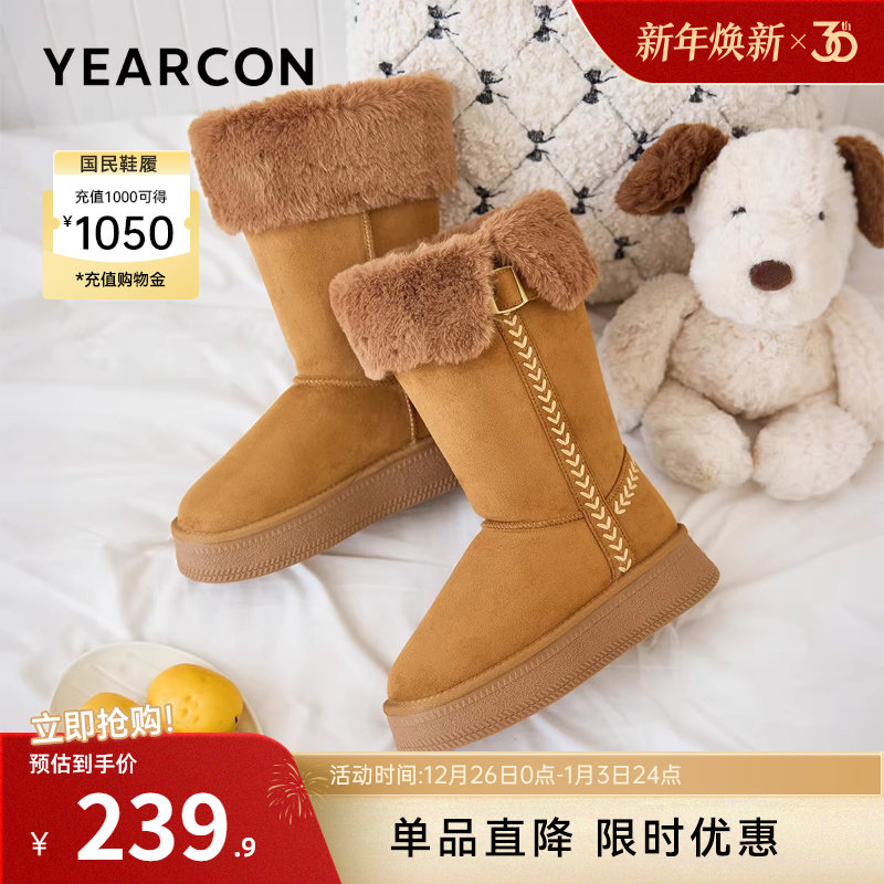意尔康女鞋2025冬季新款加绒保暖棉鞋平底高筒雪地靴户外东北靴子