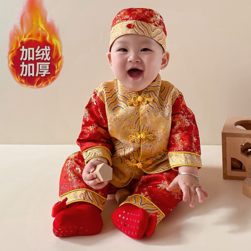 新中式周岁礼服男宝宝秋冬唐装婴儿一岁抓周红色生日套装加绒连体