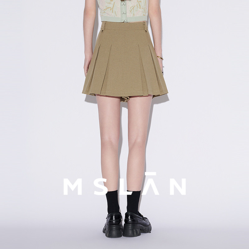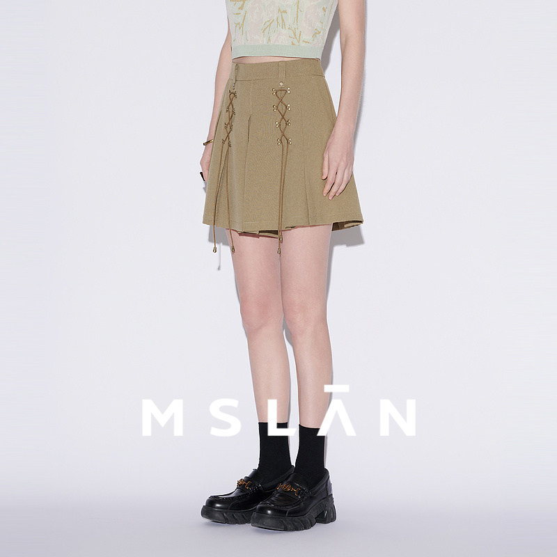 中古百褶/MSLAN春夏复古卡其A字廓形显瘦绑带短裤裤裙MGBM6901